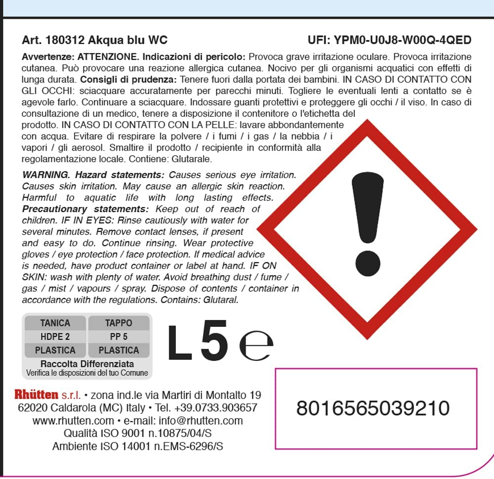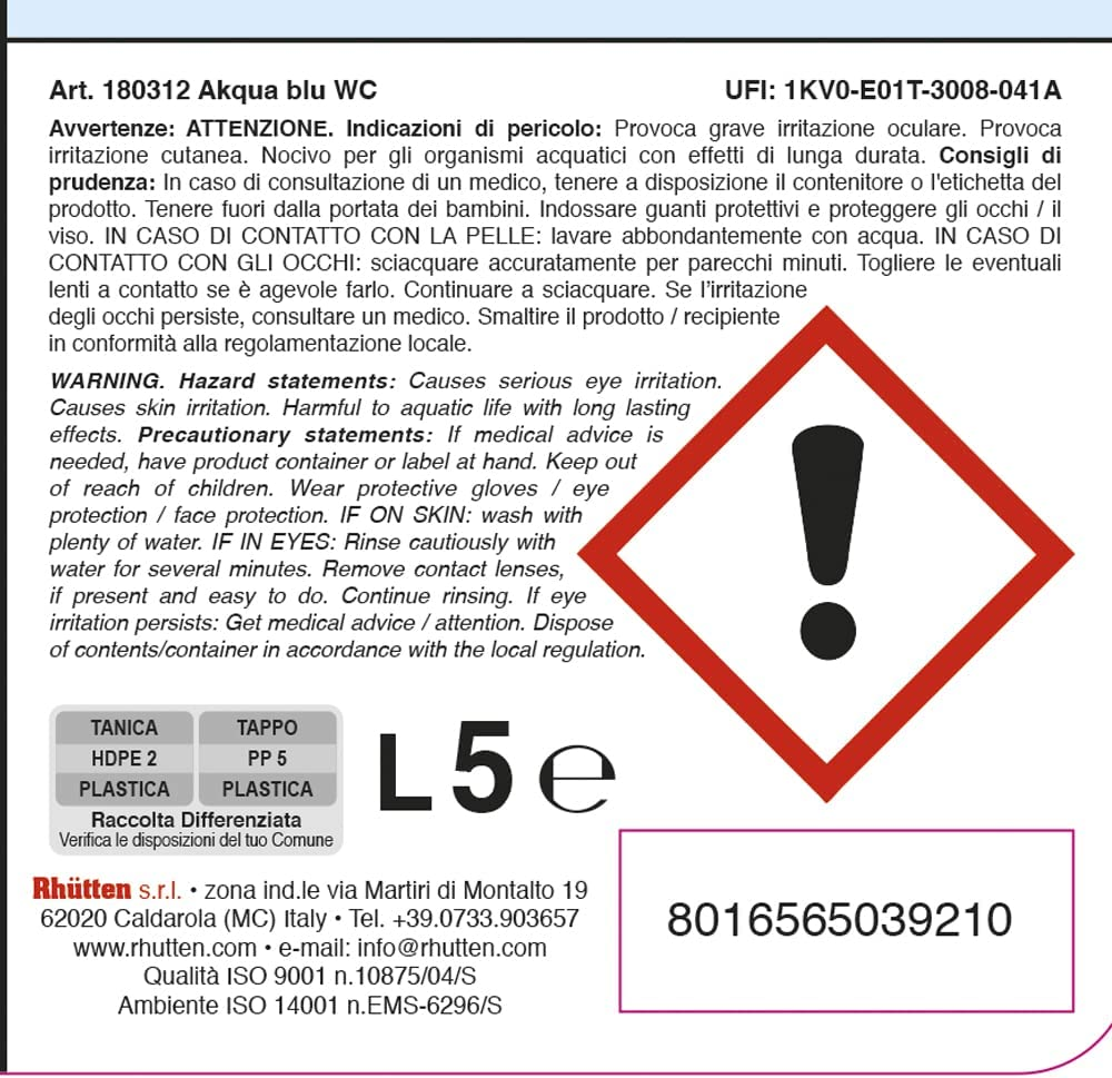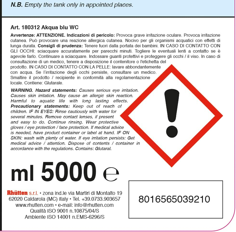| Modalità d’usoAgitare il flacone prima dell’uso. Normale manutenzione: a serbatoio vuoto e pulito, versare al suo interno 75 ml di AKQUA BLU WC ogni 10 L circa di refluo da trattare, ripetendo l’operazione ogni volta che lo si vuota. Per il mantenimento del serbatoio nei periodi di non utilizzo: dopo aver risciacquato il serbatoio, versare al suo interno 75 ml di AKQUA BLU WC, seguiti da circa 3 L di acqua. |
