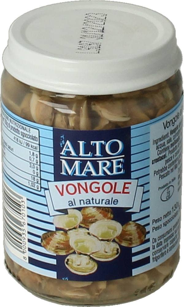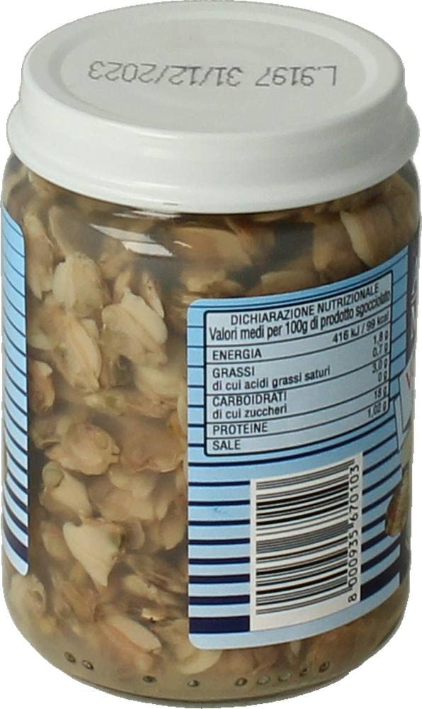 Vongole sgusciate (Venus gallina),Brodo di vongole,Acqua,Sale,Acidificante: E330,Può contenere tracce di crostacei e pesci,Potrebbe contenere gusci o frammenti di guscio.