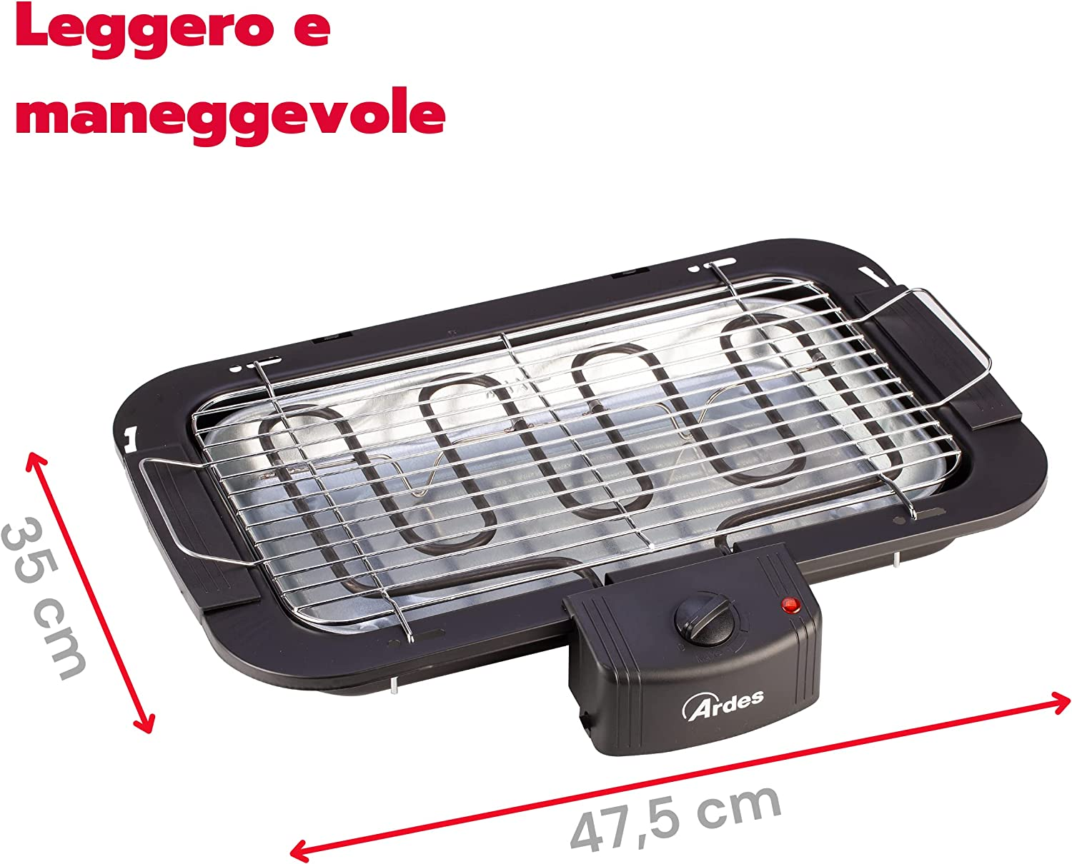 • ABMESSUNGEN UND MERKMALE | Der Elektrogrill Ardes ist 47,5 cm lang, 35 cm breit und 10 cm hoch. Er verfügt über einen abnehmbaren Stahlgrill mit den Maßen 38x22 cm und einer Leistung von 2200 W. Der Elektrogrill ermöglicht die Regulierung der Temperatur und ist mit einer Betriebsleuchte ausgestattet.