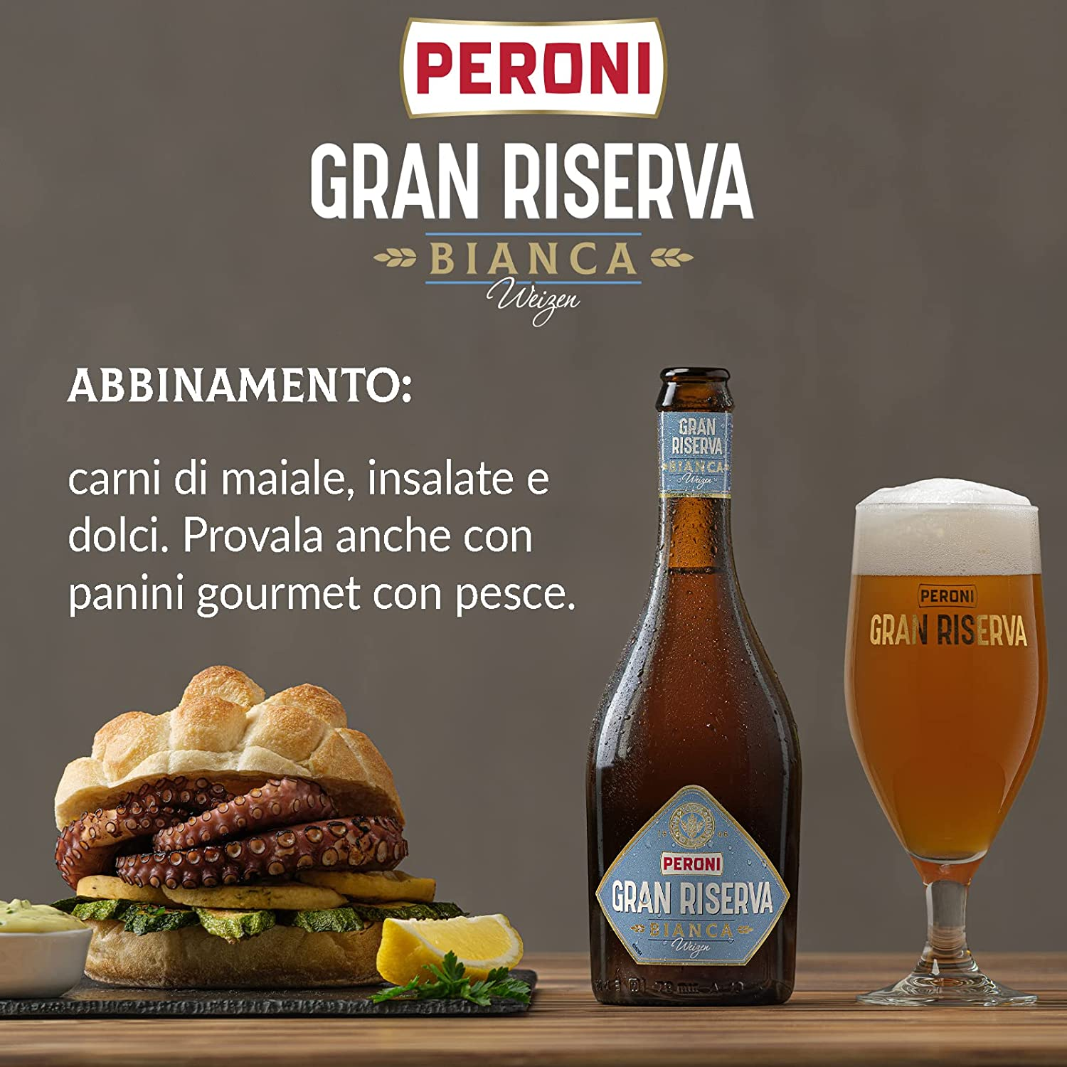 - PERONI GRAN RISERVA BIANCA: birra weizen ad alta fermentazione dal colore biondo torbido, da servire a 6-8° C in calice per birre speciali