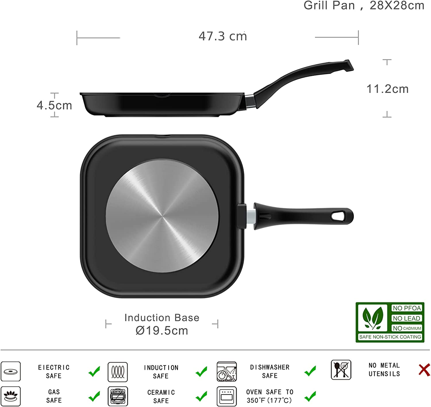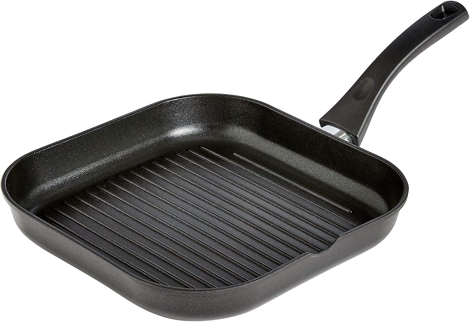 - Bistecchiera antiaderente per piano cottura a induzione (28 cm) con righe in rilievo sul fondo; aiuta a tenere il cibo rialzato e lontano dal grasso in eccesso