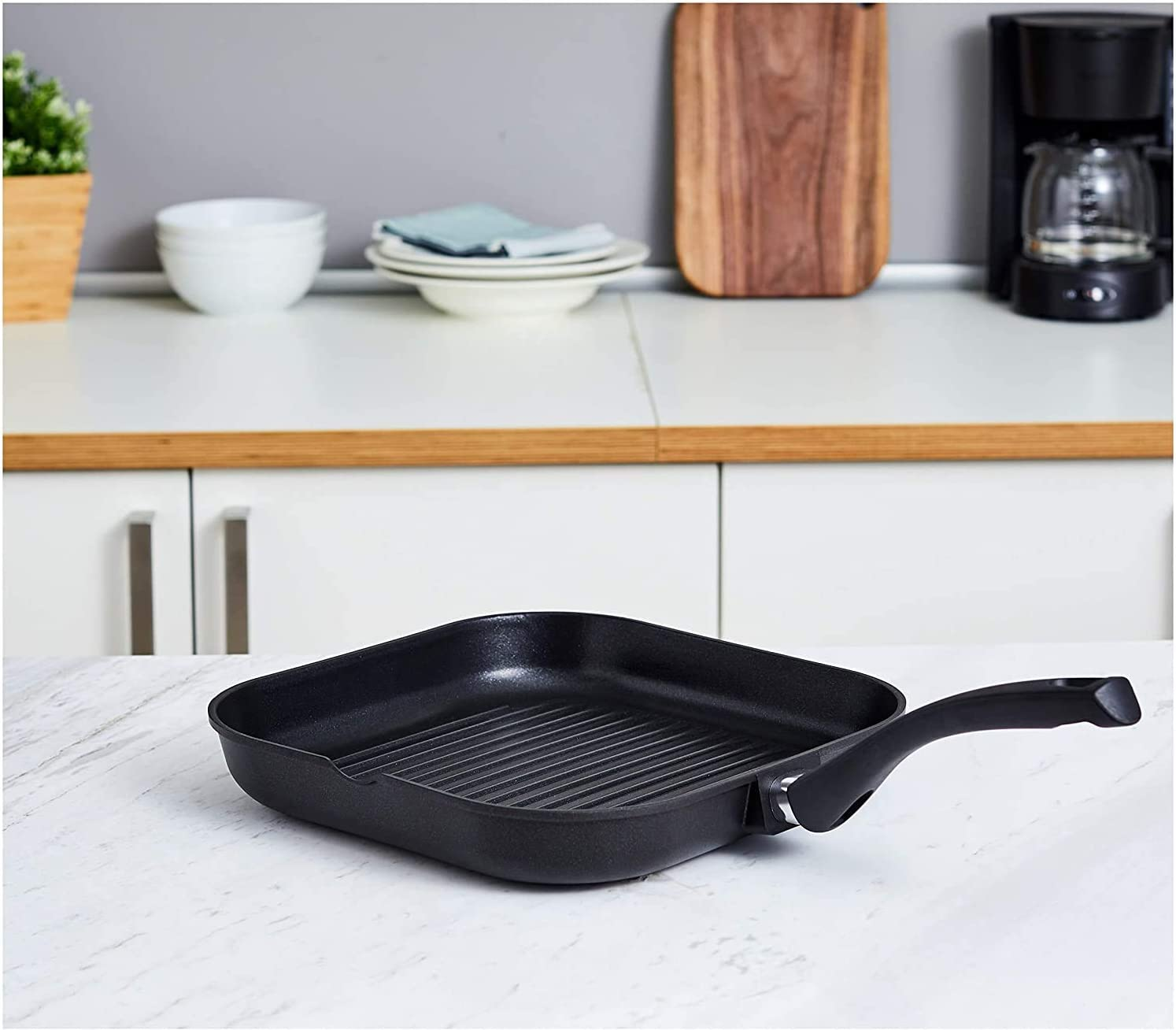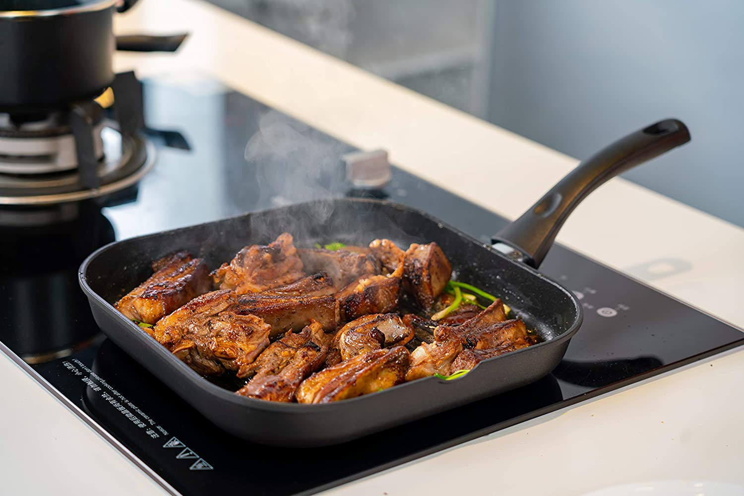 Griglia del cibo delizioso direttamente sul piano cottura con questa bistecchiera antiaderente per piano cottura a induzione di AmazonBasics. Questa padella di forma quadrata ha delle righe in rilievo sulla superficie di cottura per tenere il cibo rialzato e lontano dal grasso e dall’olio in eccesso, imprimendo allo stesso tempo i classici segni della griglia sulla carne, le verdure, i sandwich, ecc.