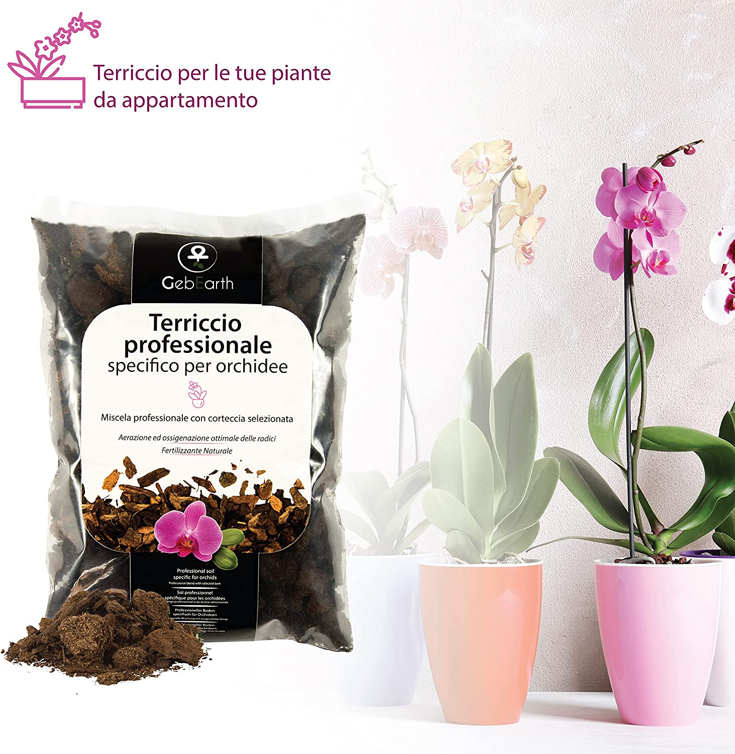 GebEarth-Orchideenerde besteht aus einer professionellen Mischung auf Basis ausgewählter Rinde und ist darauf ausgelegt, Ihrer Orchidee sofort die besten Nährstoffe zu bieten.