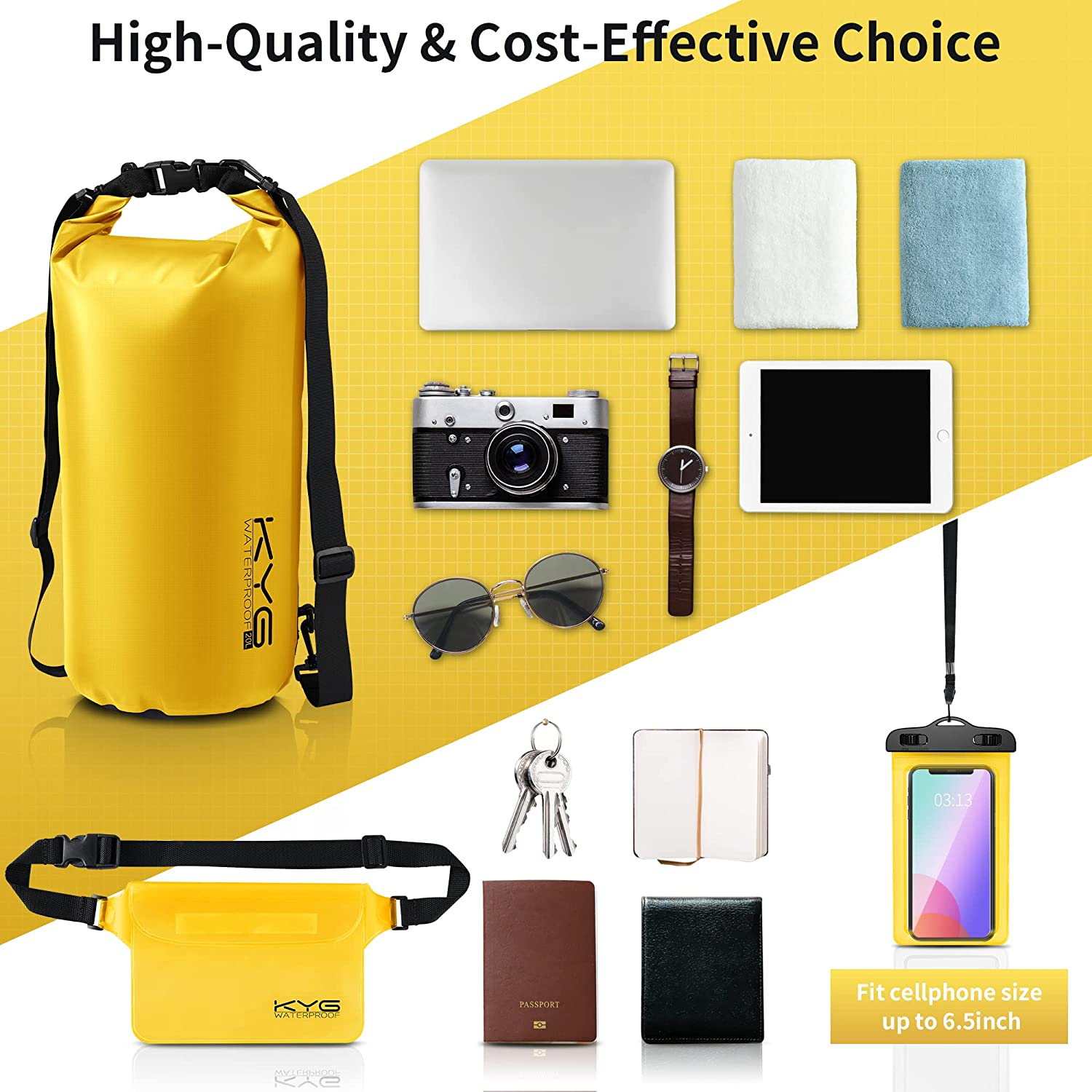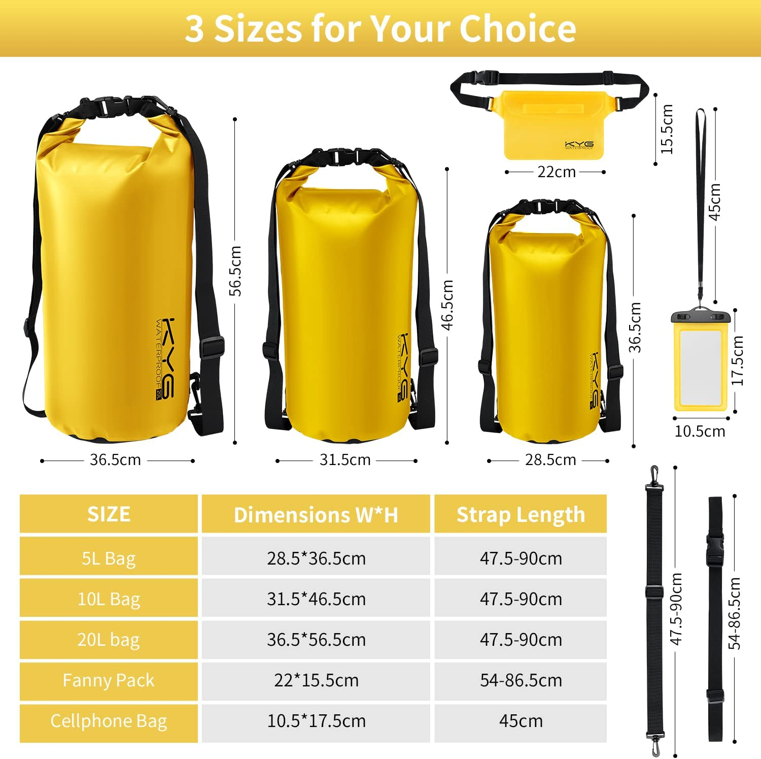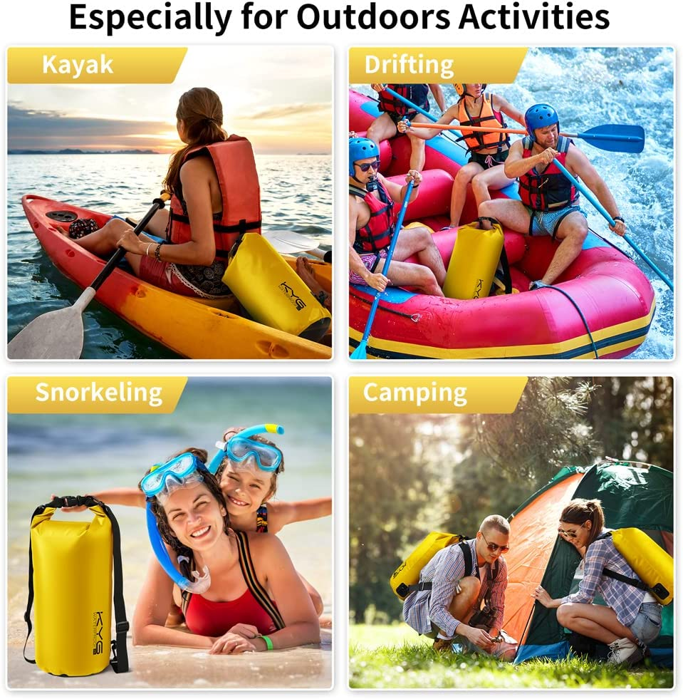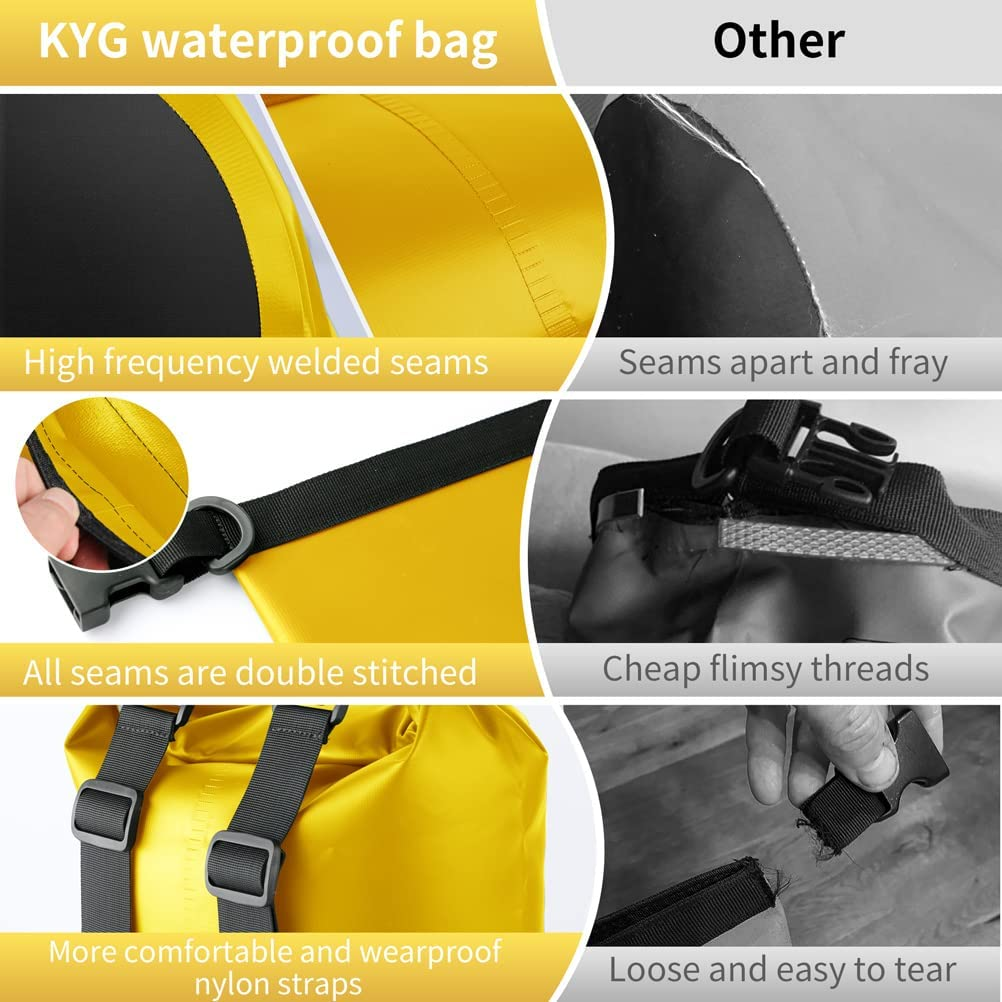 - Sacchetto Impermeabile al 100% - L'esclusivo roll top coperto a doppio strato impermeabile offre buone prestazioni impermeabili, doppio strato per una maggiore sicurezza. KYG Dry Bag ha eccellenti prestazioni impermeabili, antineve, antisabbia, antiappannamento. Non devi preoccuparti che il contenuto della borsa si bagni.