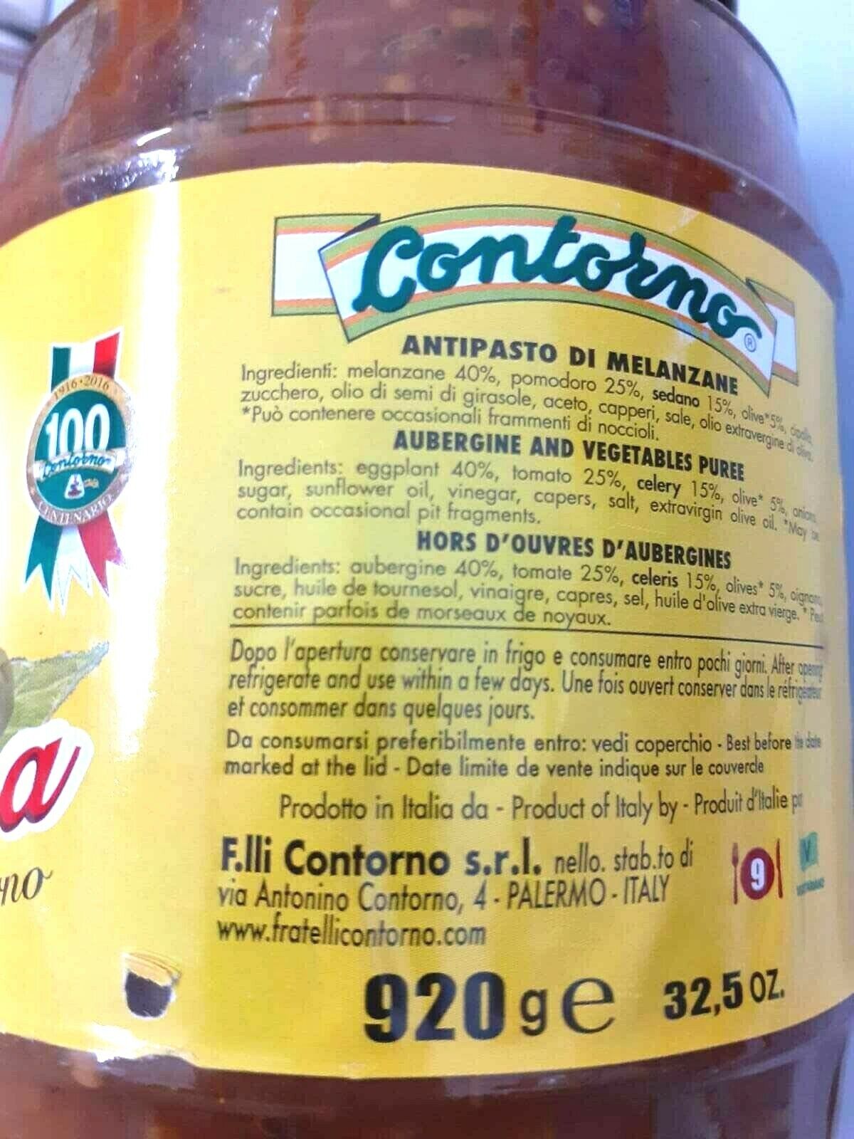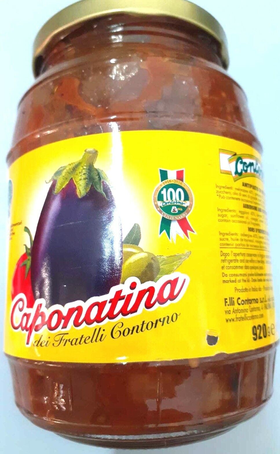 Inglese: "The Sicilian Eggplant Caponatina from the Fratelli Contorno brand. Each glass jar contains 920 grams of caponatina, and this offer includes a total of 10 jars, with a total weight of 9,200 kilograms."