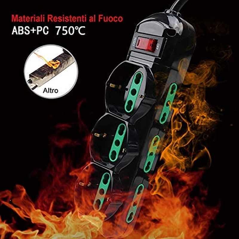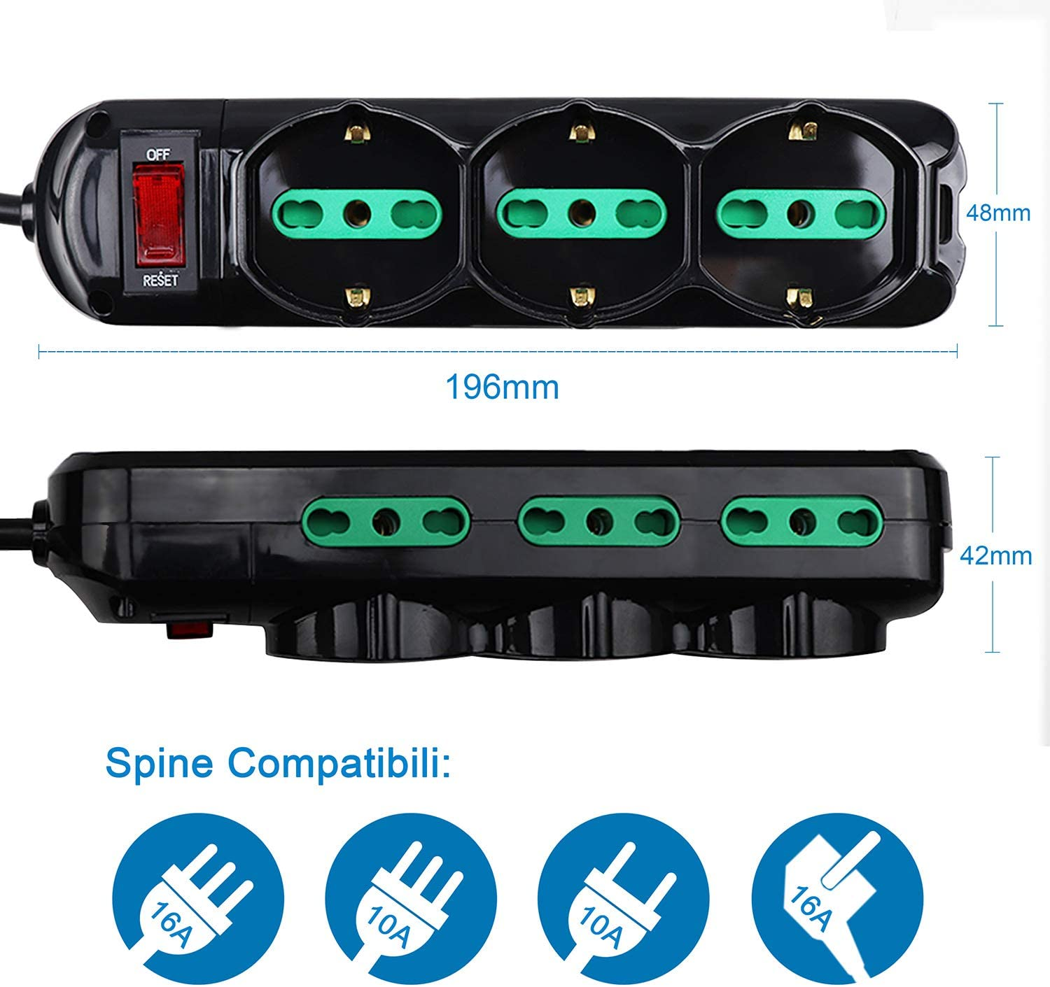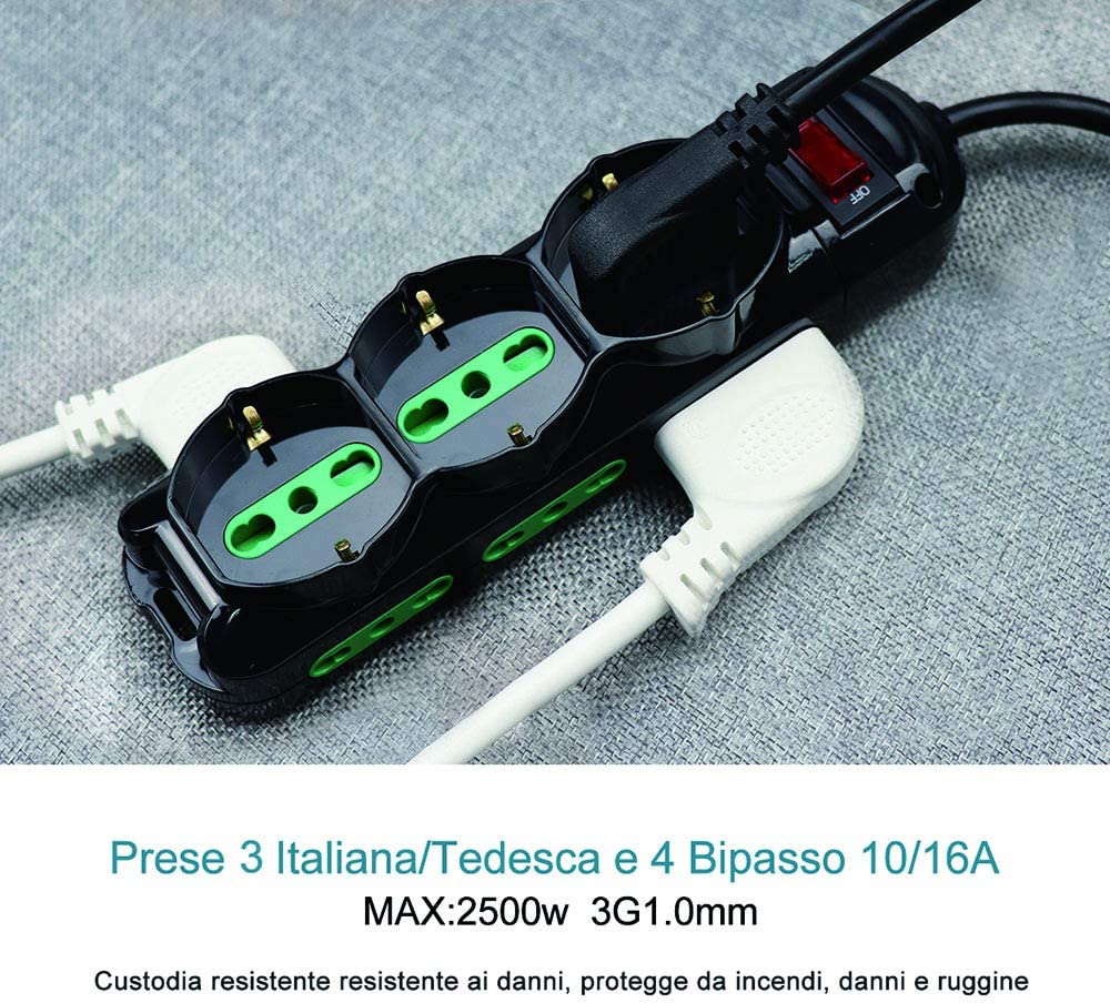 - Ciabatta Elettrica Multipresa Protetta,Surge Arrest,Protezione da sovraccarico,Protezione da surriscaldamento,Spina 10 A,Prese 3 Italiana/Tedesca e 6 Bipasso 10/16A, Interruttore di sicurezza,Bianco Cavo da 1.5m.