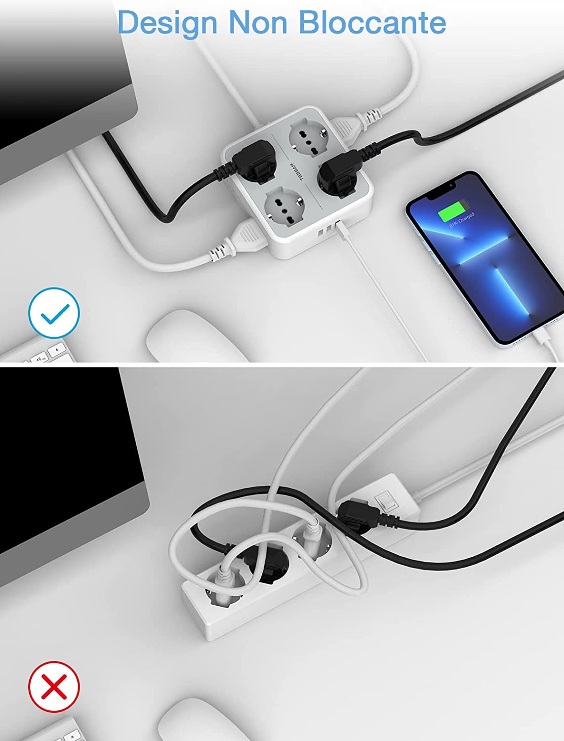 - Design Unico: le ciabatta multipresa USB hanno un design compatto con prese multiple e USB su un cubo di 11,7x12,5x4,1cm, dandoti più prese in uno spazio minore. Le prese sono distanziate di oltre 5 cm al centro per garantire che non interferiscano l'una con l'altra. Inoltre le ciabatta elettriche hanno una lunghezza del cavo di 2M e le multipresa da scrivania possono essere posizionate dove vuoi.