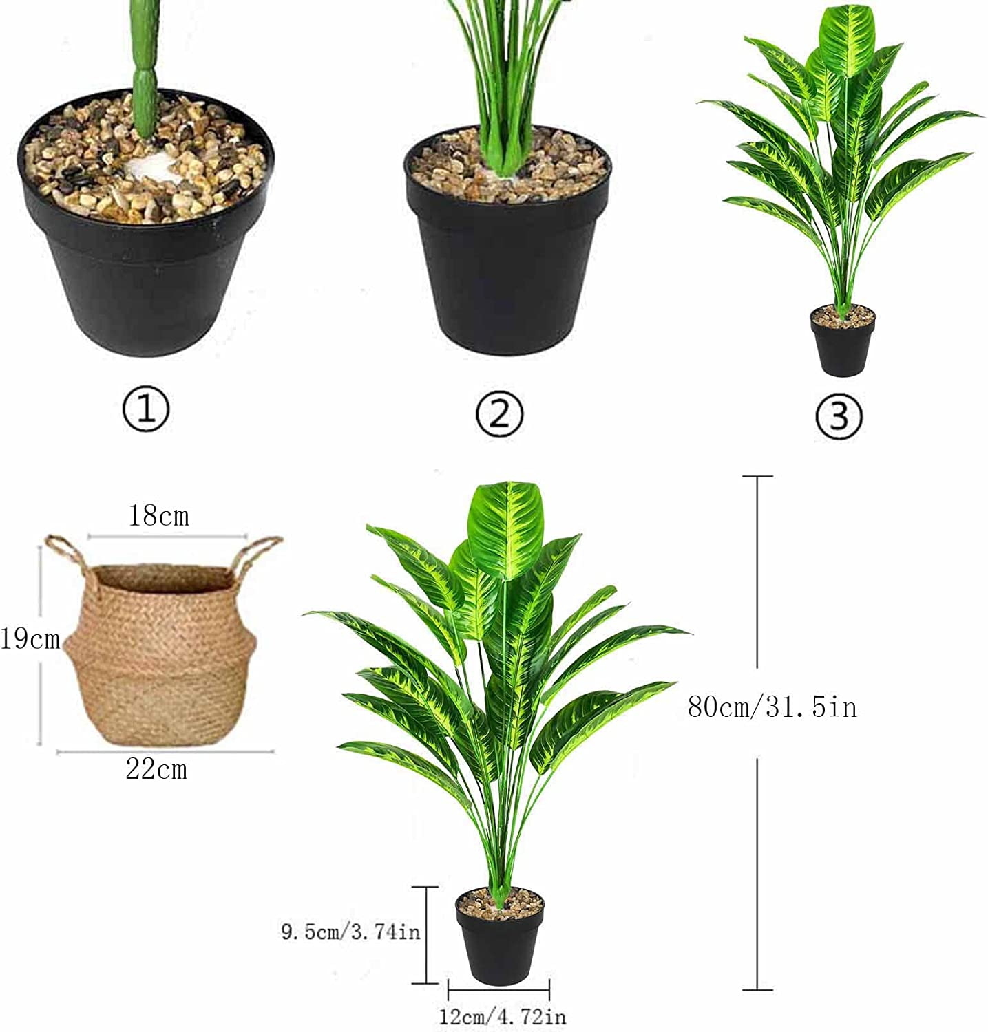 【Material】Plant: plastic and wire (the stems are wired and can be shaped according to your needs). Black pot: natural gravel, foam, plastic. Woven basket: natural seaweed (suggest covering the base of the pot with a layer of gravel or soil, make the plants more realistic and balanced.) 【Sturdy and Adjustable】For easy carrying, the stems are curled in the package. Our simulation plants equipped with sturdy internal metal wires, you can easily adjust the trunk to the shape you like or restore the original appearance, without worrying about the bird of paradise tree trunk breaking. Extension: artificial bird of paradise, palm decoration, tropical banana leaf, banana leaf, artificial banana leaf plant, fake monstera, fake palm frond plant, plastic plant, artificial greenery, fake palm plants.
