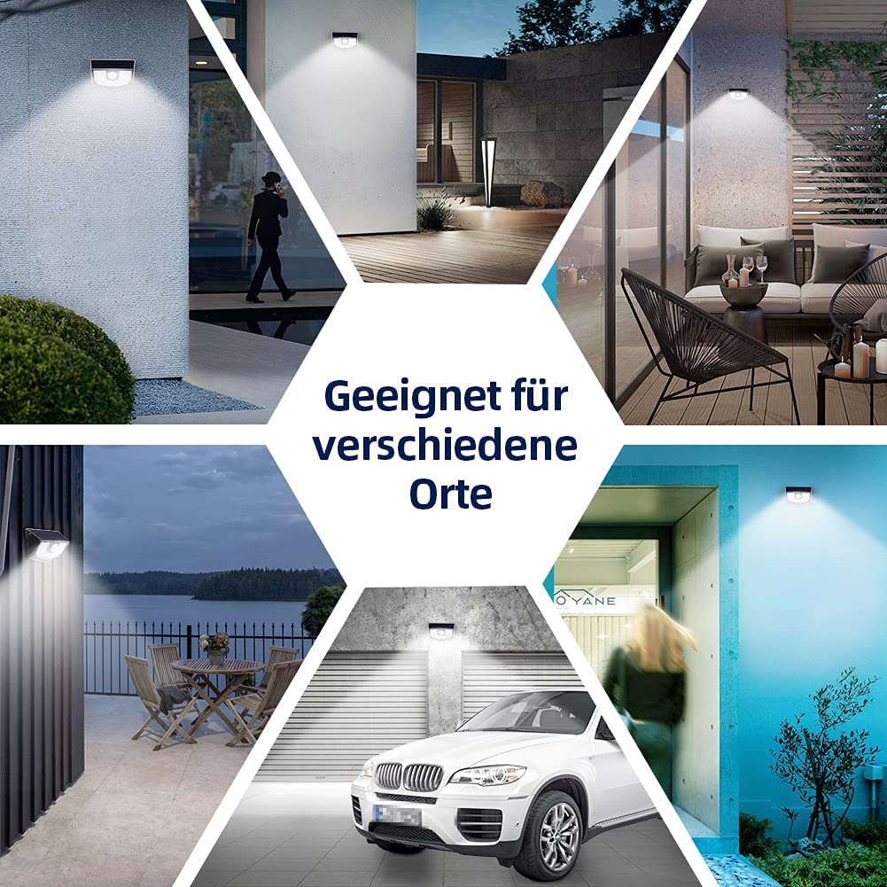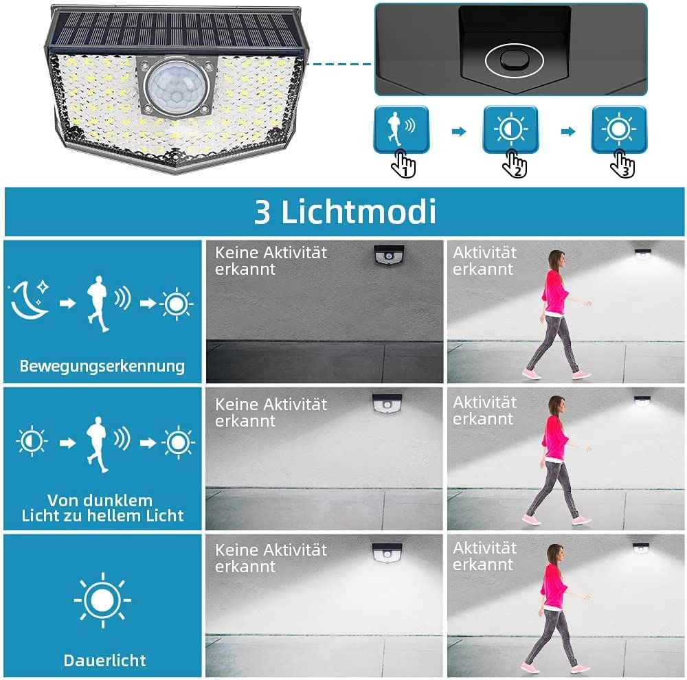 • 【3 modalità di illuminazione intelligente】Modalità sensore 1: nessuna luce quando non viene rilevato nessun movimento, e passa ad alta luminosità quando viene rilevato un movimento; Modalità sensore 2: bassa luminosità quando non viene rilevato nessun movimento, alta luminosità quando viene rilevato un movimento; Modalità di illuminazione continua: Lampade solari a LED per esterni saranno sempre accese la notte.
