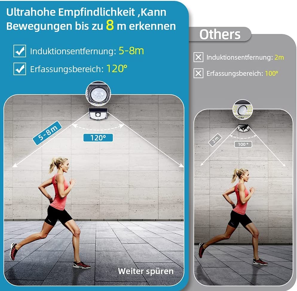 Distanza di rilevamento 5-8 Metri, angolo di rilevamento 120 °. Questa luce solare esterna ha