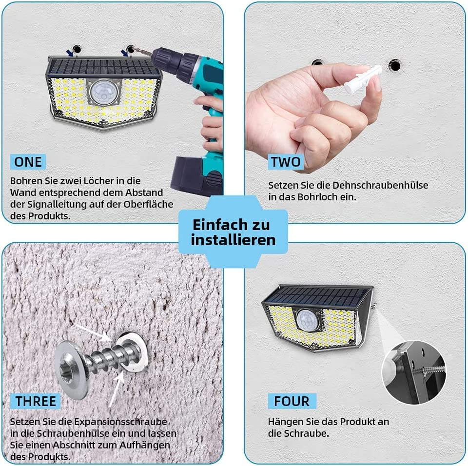 • 【Facile da installare】Nessun filo necessario, basta forare due fori corrispondenti nel muro in funzione della linea di marcatura sulla parte superiore del prodotto, inserire le viti e appendere la lampada sulle viti. Faretti solari a led da esterno è molto adatta per il vostro giardino, terrazza, parete, ecc.