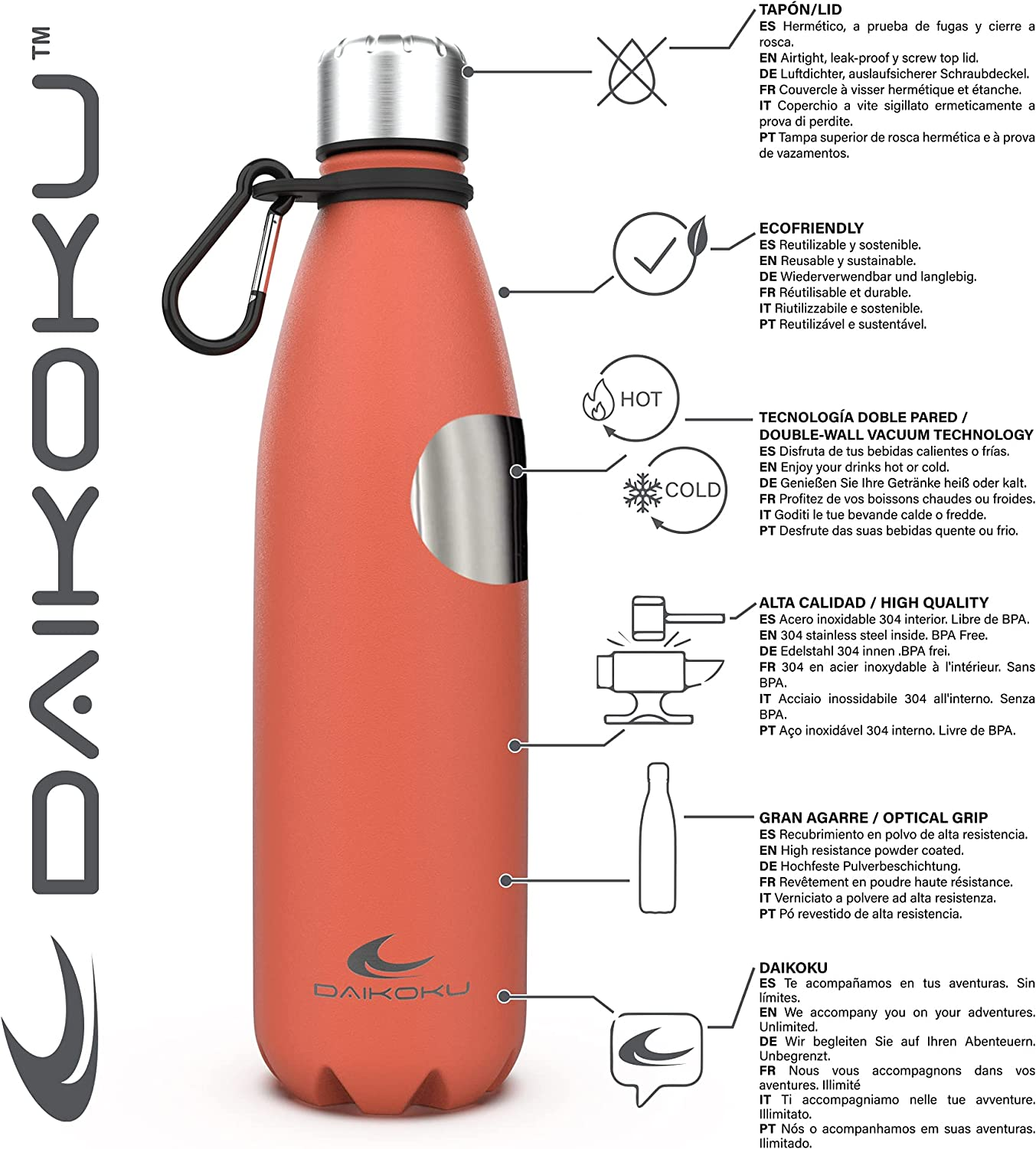 - Daikoku-Flasche aus BPA-freiem Edelstahl (für Flüssigkeiten giftiger Kunststoff) mit Doppelwand und gummierter Oberfläche, die sich angenehm anfühlt.
