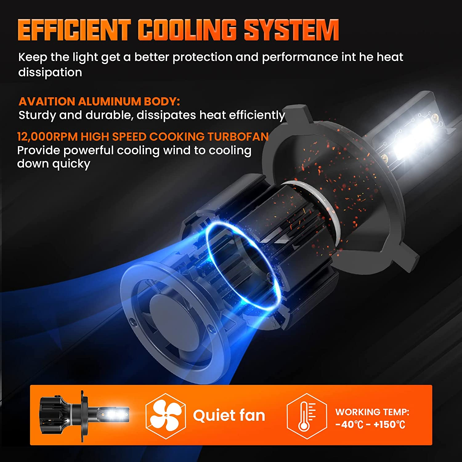 - 【Oltre 50.000 ore di Durata】 - Le lampadine LED H4 con corpo in alluminio aeronautico e substrato in rame a dissipazione del calore, la ventola turbo cool silenziosa da 12.000 giri/min forniscono una capacità di super raffreddamento, che garantisce una durata maggiore fino a 50.000 ore, per eliminare le frequenti sostituzioni delle lampadine.
