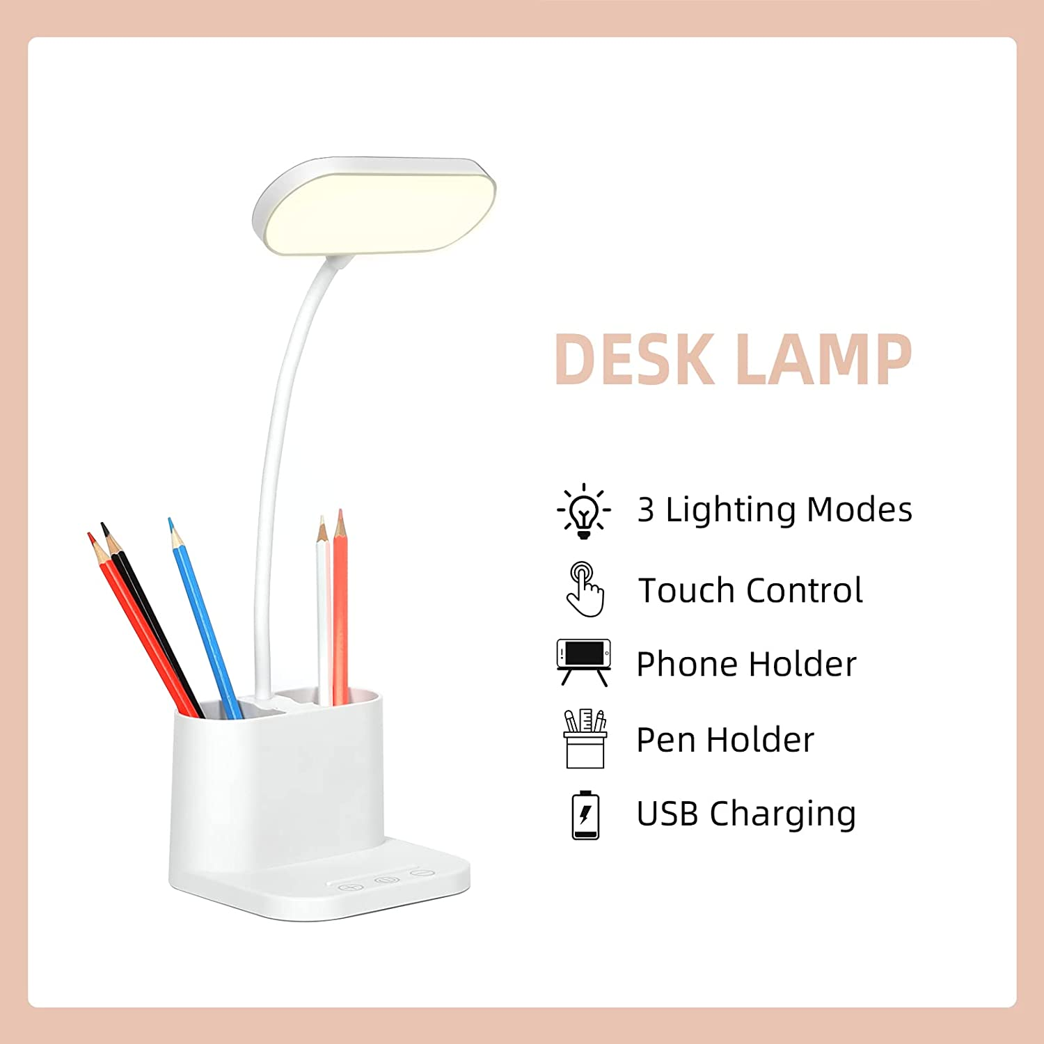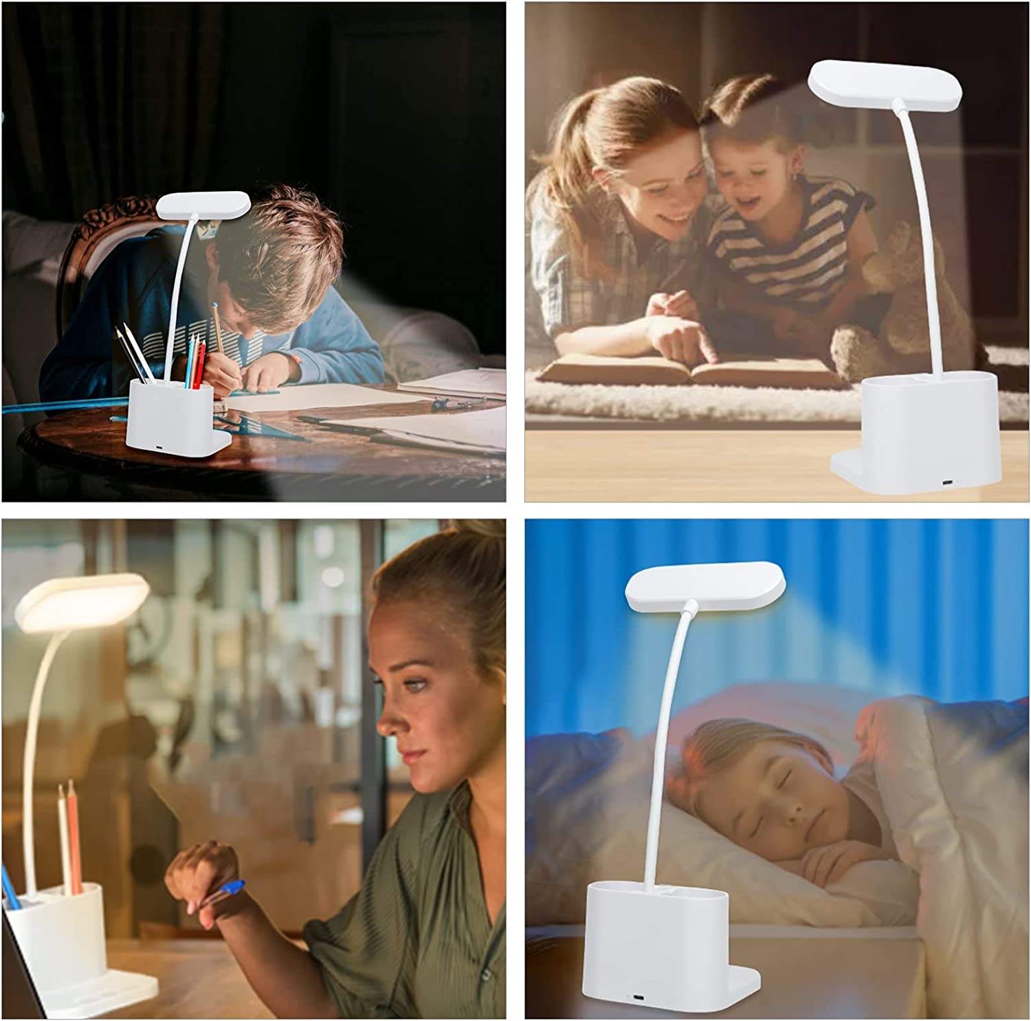 【Mode de soin des yeux et luminosité à 8 niveaux】 16 boules de lampe LED, avec 3 modes d'éclairage (lumière chaude, lumière blanche, lumière mixte blanc chaud), contrôle tactile sensible, sélection de luminosité à 8 niveaux (appui long : atténuation continue) ; la lumière est douce, sans scintillement, sans éblouissement et protège les yeux. 【Lampe de bureau multifonctionnelle】 La conception du porte-stylo, conçue pour ranger la papeterie afin de garder votre bureau bien rangé et bien rangé; La conception du support de téléphone portable est pratique pour regarder des vidéos ; le tube de forme flexible peut être plié à n'importe quel angle de 360º, dirigez la lumière vers n'importe quel endroit que vous souhaitez éclairer 【Conception portable】 La lampe de bureau a un design compact, une pe