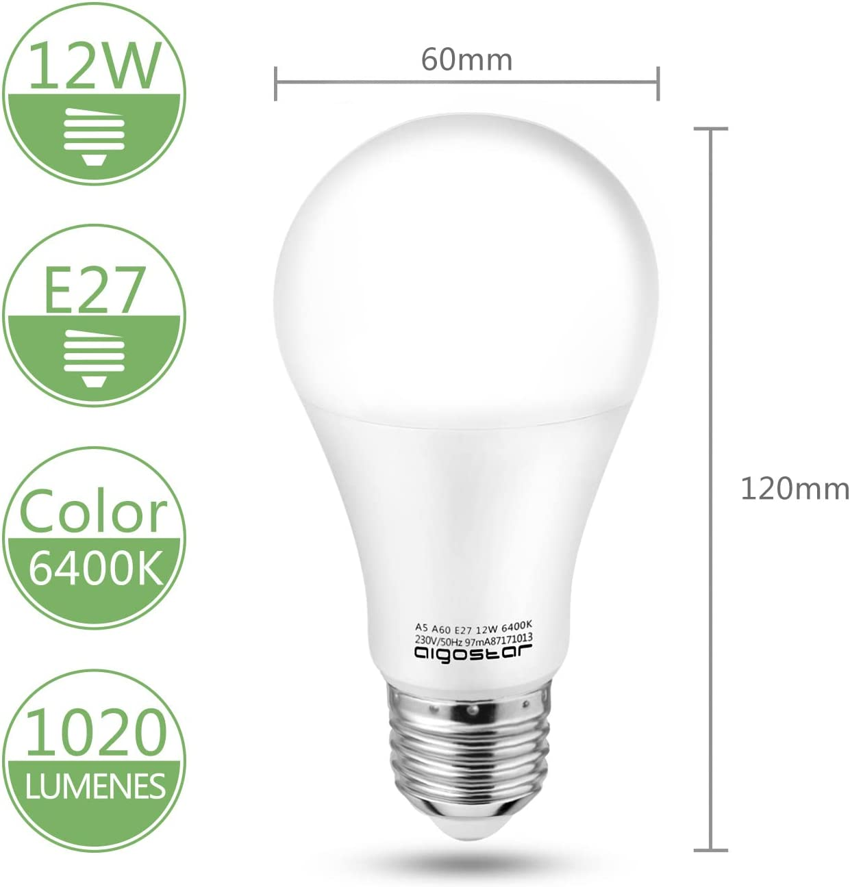 - 【Spezifikationen】LED-Leuchtmittel mit E27-Fassung. Kaltweißes Licht 6400 K, 1020 Lumen, nicht dimmbar. A+ Energieeffizienz.