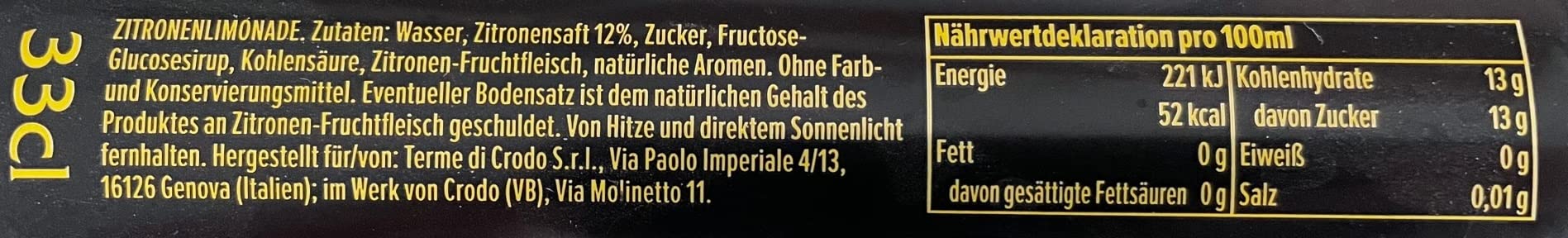Ingredienti: acqua minerale, succo di limone 12%, zucchero, sciroppo di glucosio fruttosio, anidride carbonica, polpa di limone, aromi naturali. Dichiarazione dei valori nutrizionali per 100 ml: energia: 221 kJ / 52 kcal, grassi: 0 g, di cui acidi grassi saturi: 0 g, carboidrati: 13 g, di cui zuccheri: 13 g, proteine: 0 g, proteine: 0 g. Sale: 0,0 1 g. Ingredienti: acqua, succo di limone 12%, zucchero, sciroppo di glucosio di fruttosio, anidride carbonica, depurazione di frutta di limone, aromi naturali. Senza coloranti e conservanti. Distributore: Cioccolato Ring Bevande e Dolcetti eG, Ketzelstraße 7, 90419 Norimberga