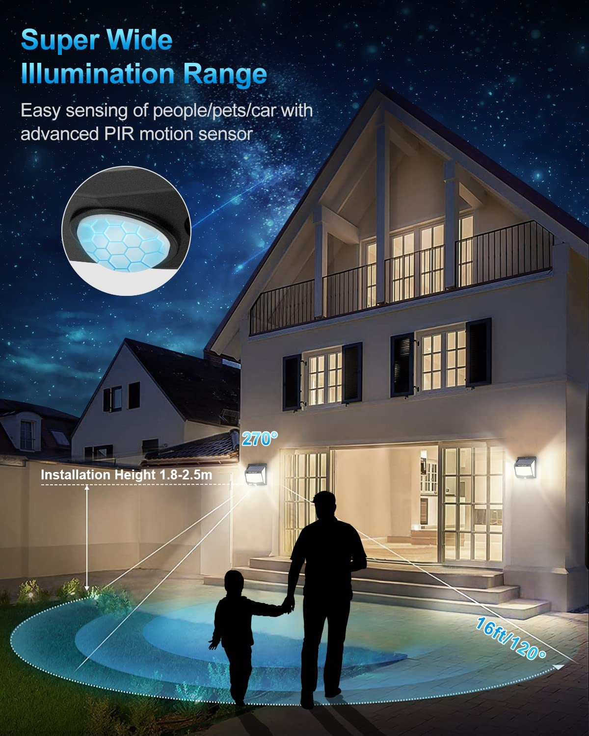 Die Solar-Außenleuchte ist mit 218 Hochleistungs-LEDs, 270° breitem Beleuchtungswinkel und 3 Beleuchtungsflächen ausgestattet, die SEZAC Solar-Außenleuchte kann hervorragende Helligkeit und Abdeckung bieten. Viel heller als andere LED-Solarleuchten für den Außenbereich. Die LED auf beiden Seiten sorgt für ausreichend zusätzliches Licht, diese LED-Solarleuchten für den Außenbereich eignen sich perfekt für die Beleuchtung des Gartenbereichs im Freien.