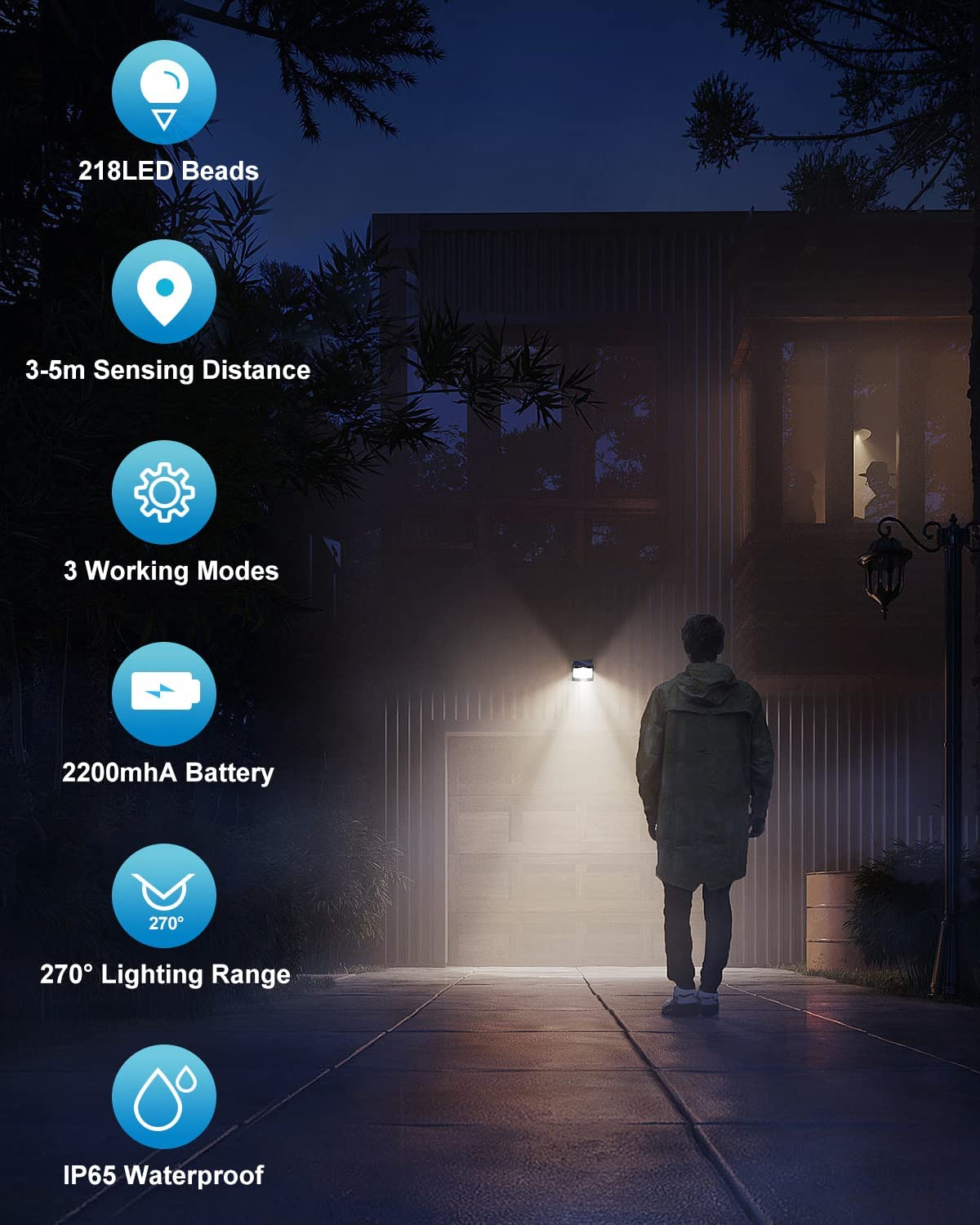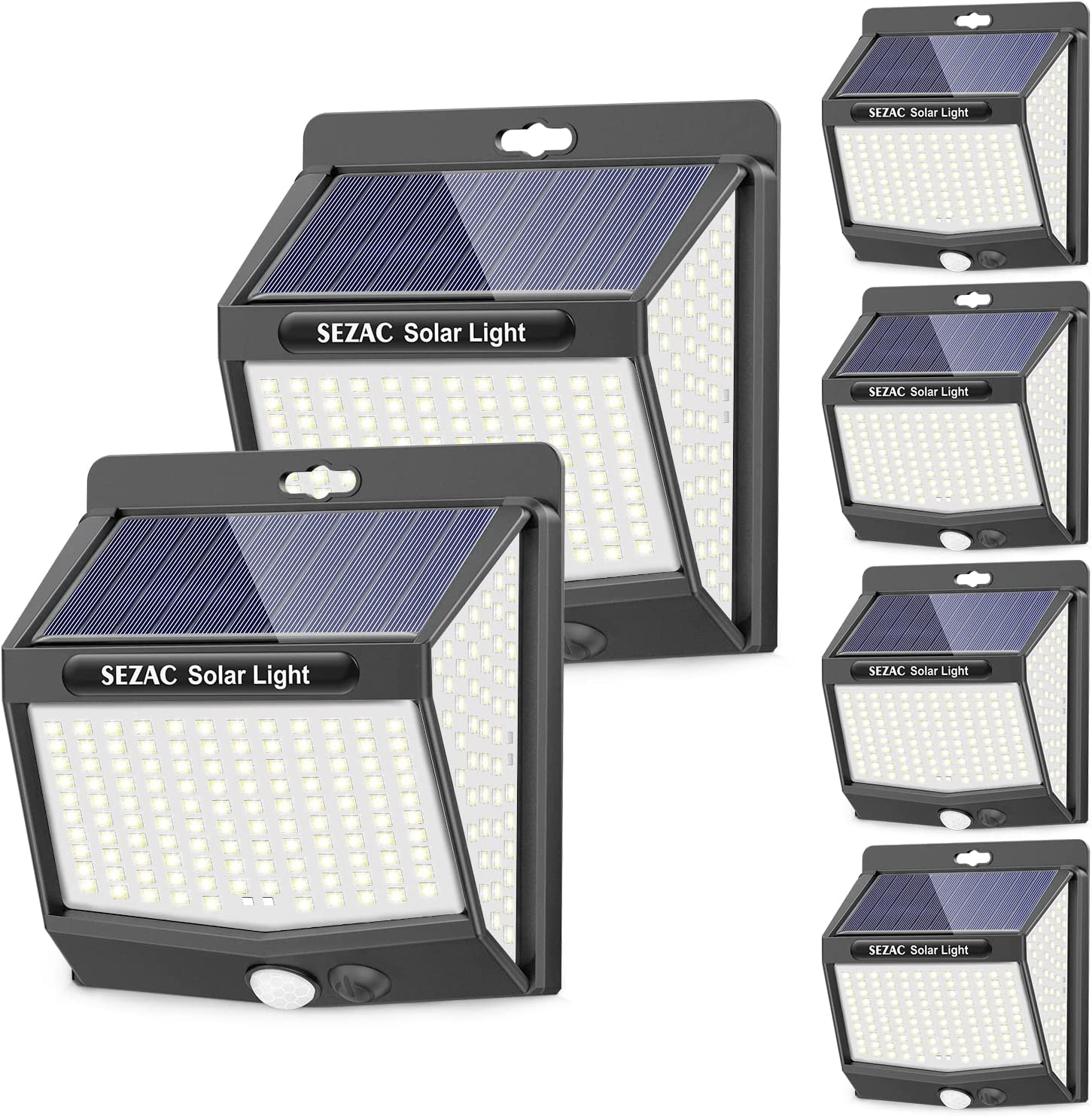 ♻【Solarbetriebene Lichter】: SEZAC 218 LED-Solarleuchte für den Außenbereich, eingebauter wiederaufladbarer 2200-mAh-Lithium-Ionen-Akku, dessen Akkukapazität höher ist als bei anderen Solarleuchten für den Außenbereich. Unsere LED-Solarleuchte für den Außenbereich kann nachts über 8–10 Stunden halten, wenn sie tagsüber voll aufgeladen ist (ausreichend Sonnenlicht absorbieren). Sparen Sie Energiekosten und lassen Sie es nach der ersten Installation in Ruhe. Die Solar-Außenleuchte ist mit 218 Hochleistungs-LEDs, 270° breitem Beleuchtungswinkel und 3 Beleuchtungsflächen ausgestattet, die SEZAC Solar-Außenleuchte kann hervorragende Helligkeit und Abdeckung bieten. Viel heller als andere LED-Solarleuchten für den Außenbereich. Die LED auf beiden Seiten sorgt für ausreichend zusätzliches Licht,