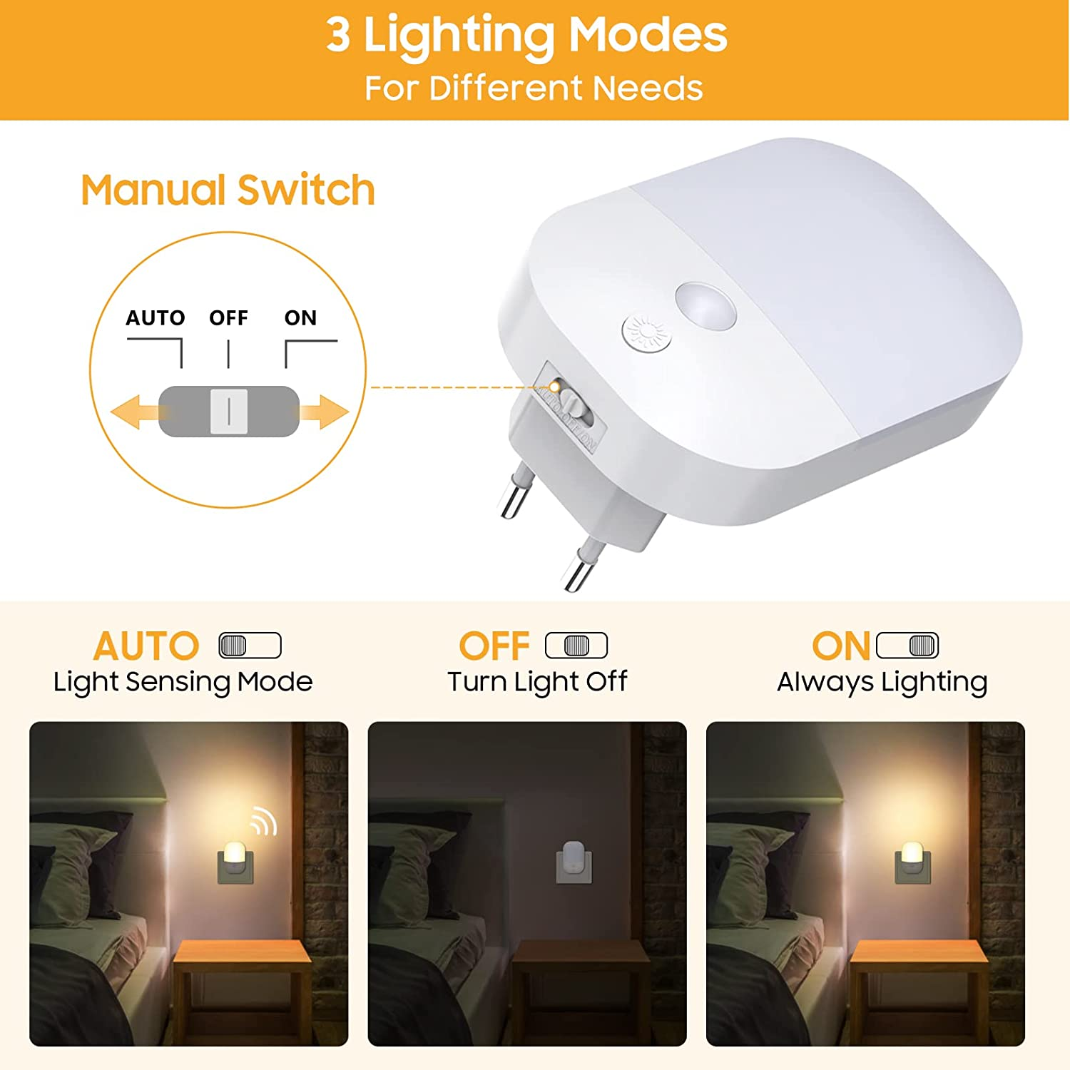 - 💡【3 Beleuchtungsmodi】: Eingebauter Lichtsensor, dieses Plug-in-Nachtlicht kann Dunkelheit erkennen und leuchtet automatisch auf. Im AUTO-Modus schaltet sich das LED-Nachtlicht bei Dämmerung, Nacht oder schlechten Lichtverhältnissen automatisch ein und im Morgengrauen, tagsüber oder bei starken Lichtverhältnissen aus. Sie können je nach Bedarf auch manuell zwischen den AUS/EIN-Modi wählen.
