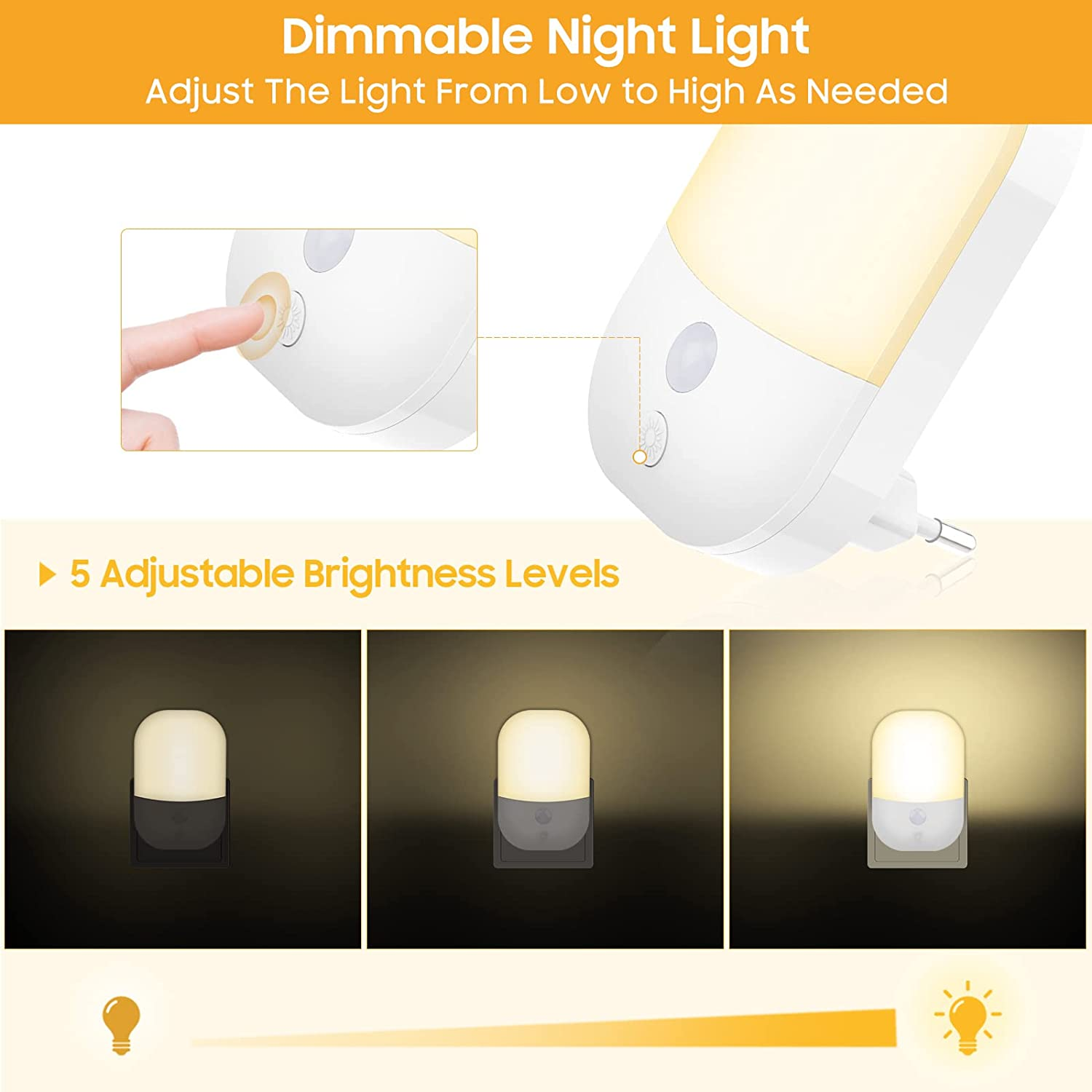 - 💡【Dimmbare Helligkeit】: Das LED-Nachtlicht verfügt über 5 zyklisch einstellbare Helligkeitsstufen (20 %, 40 %, 60 %, 80 % und 100 %), der untere Schalter hilft Ihnen, die Helligkeit anzupassen und sorgt für Sicherheit im Dunkeln.