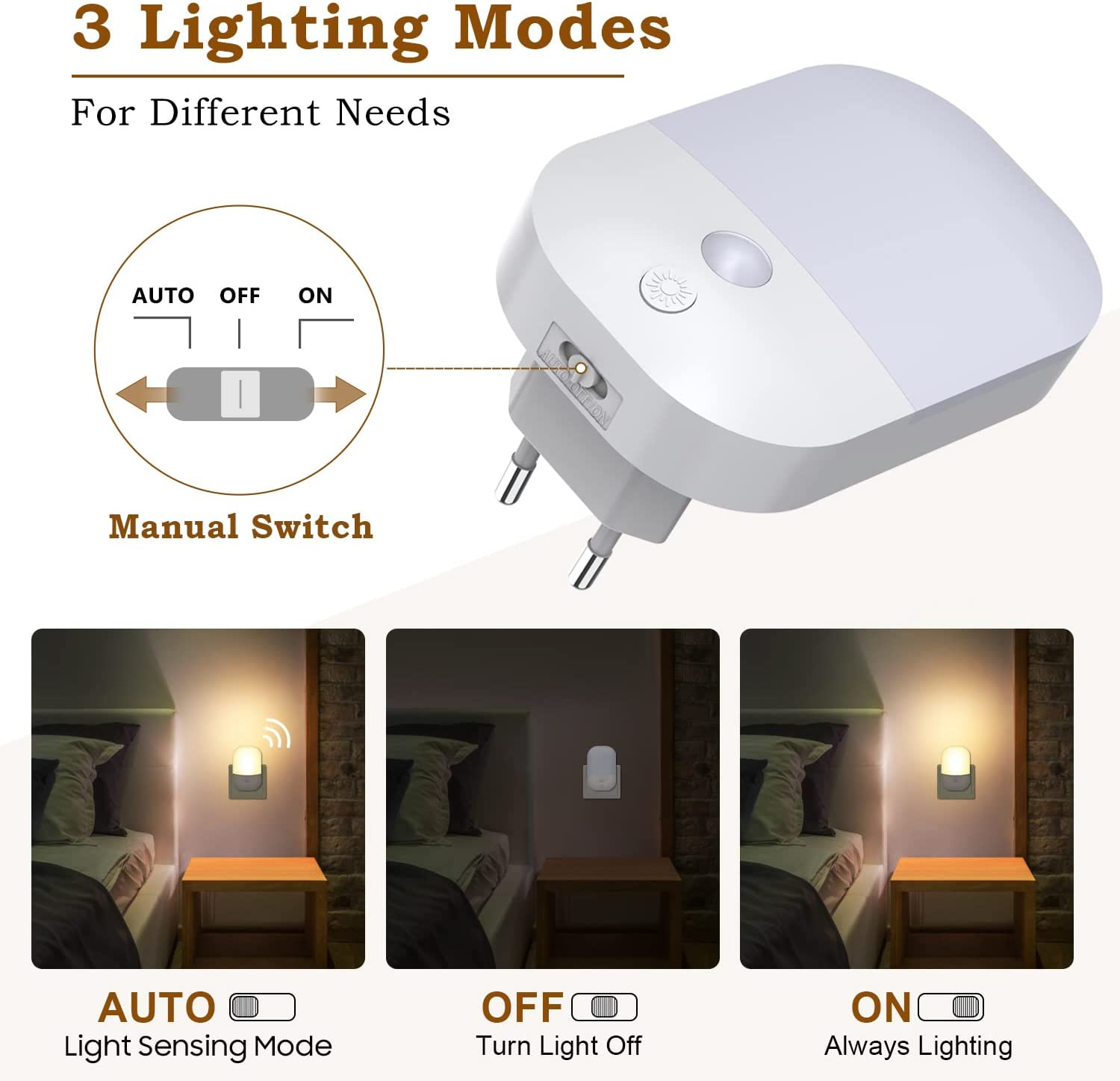 • 💡 【3 Modalità di Illuminazione: AUTO/OFF/ON】: Questa luce notturna LED ha il sensore fotocellula dal tramonto all'alba, può rilevare l'oscurità e accendersi automaticamente. Nella modalità AUTO, l'illuminazione notturna si accenderà automaticamente al tramonto, di notte o in condizioni di scarsa illuminazione e si spegnerà automaticamente all'alba, durante il giorno o in condizioni di elevata illuminazione. Puoi anche scegliere manualmente le modalità OFF/ON secondo necessità.