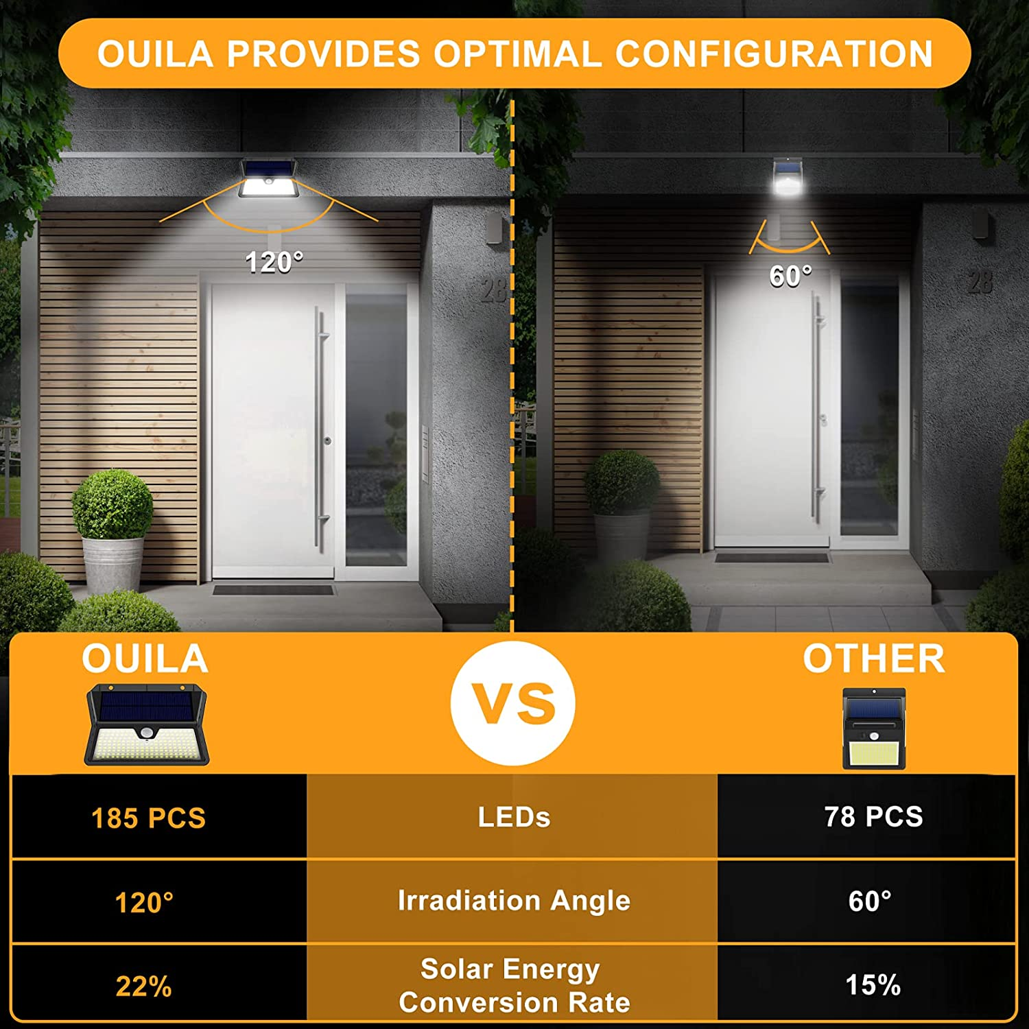Tasso di conversione dell'energia solare del 22%.Utilizzando il design del pannello solare in silicio monocristallino, la lampada da parete solare per esterni OUILA aumenta il tasso di conversione dell'energia solare dal 19% al 22%. Converte completamente e utilizza l'energia solare e può essere ricaricato bene nei giorni nuvolosi. | Ampia illuminazione e sensore di movimento PIR 2023Con un sensore di movimento PIR aggiornato, è in grado di rilevare il movimento entro un angolo di rilevamento di 120º e una gamma del sensore di 16,4 ~ 26,2 piedi (5 ~ 8 m). Allo stesso tempo, la lampada da parete solare può rilevare il movimento in modo più sensibile. | 185 LEDsDotata di 185 perline per lampade a LEDs super luminose, quasi il doppio della quantità di prodotti simili sul mercato, l'applique solare per esterni OUILA dotata di perline per lampade a LED super luminose può fornirti un'illuminazione super luminosa ed eccellente. |