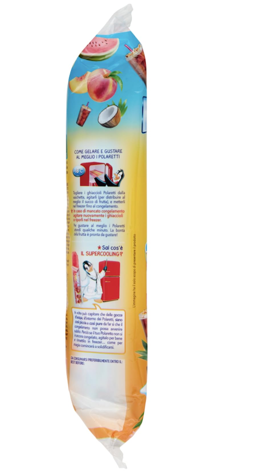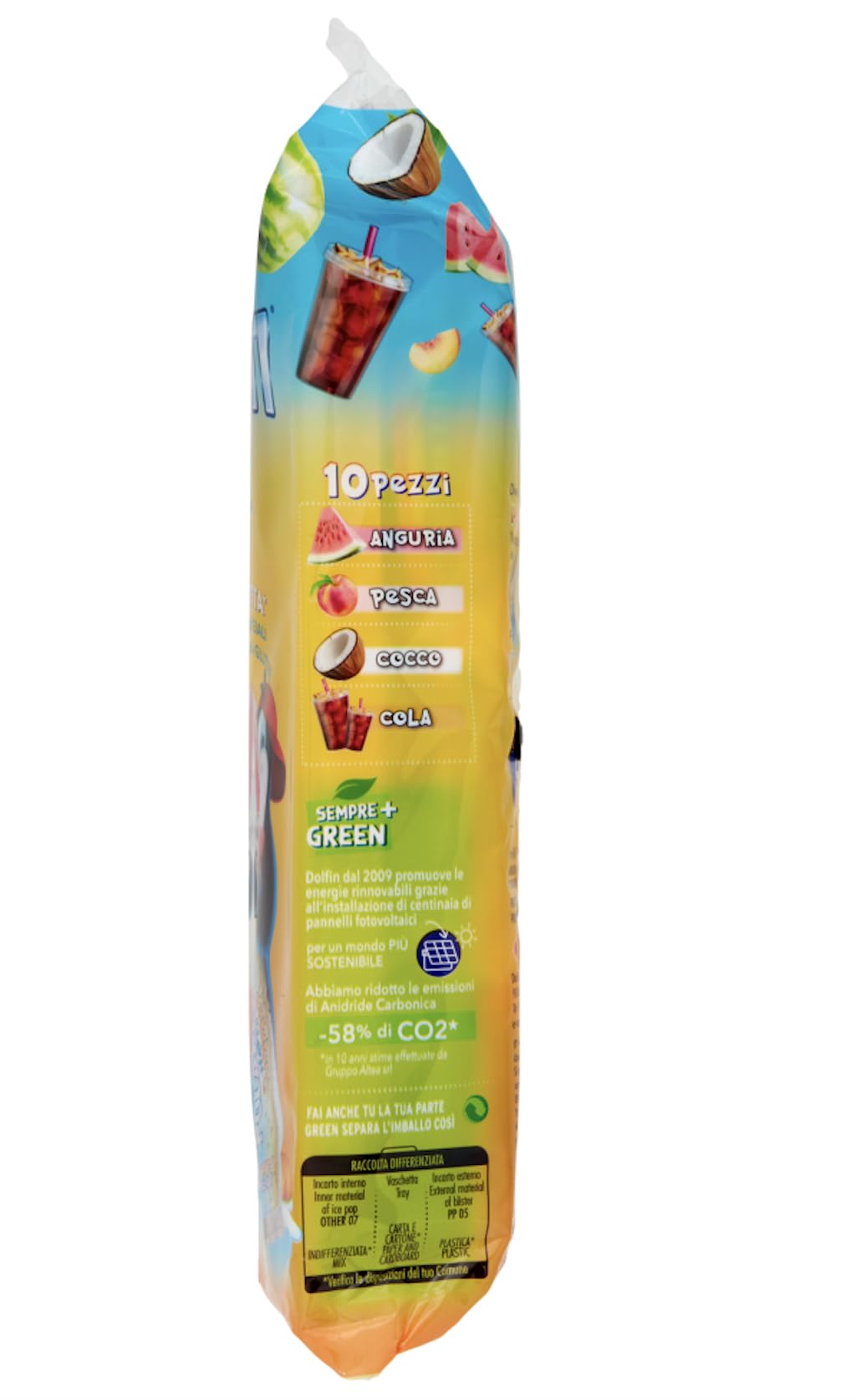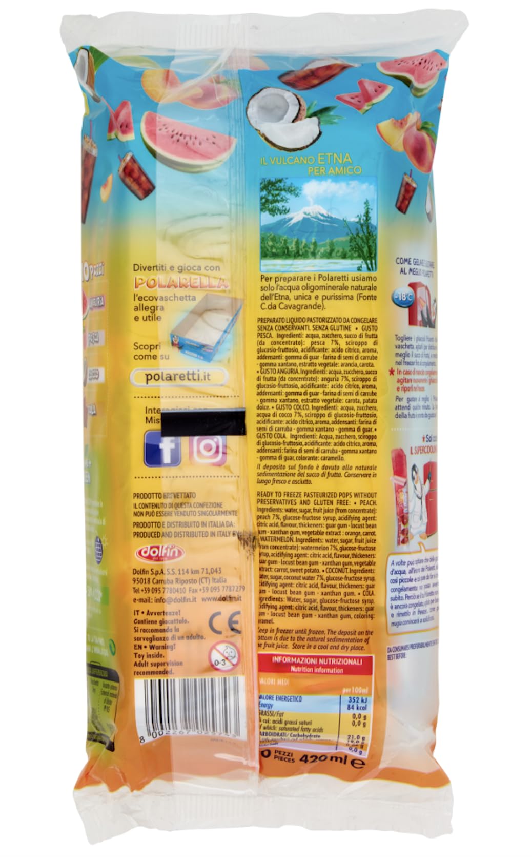Preparato dolciario liquido pastorizzato da congelare. Ghiaccioli POLARETTI pronti da gelare DOLFIN gusti assortiti (Pesca Anguria Cocco Cola) Subito in REGALO 2 POLAR TATTOO SENZA GLUTINE GLUTEN FREE SENZA CONSERVANTI SENZA COLORANTI ARTIFICIALI Modalità d'uso: 1. Togliere i ghiaccioli Polaretti dalla vaschetta 2. Agitare bene (per distribuire al meglio il succo di frutta) e mettere in congelatore( o freezer) per circa 4 ore 3. Estrarre la confezione da congelatore 10 minuti prima di gustarla. In caso di mancato congelamento agitare nuovamente i ghiaccioli e riporli nel freezer Imballo: 5x10 Polaretti - 5x420 Ml Valori Nutrizionali Medi per 100 Ml: Energia Preparato: 352 Kj / 84 Kcal Grassi Preparato: 0 g di cui acidi grassi saturi: 0 g Carboidrati: 21 g di cui zuccheri: 19 g Proteine: 0,06 g Sale: 0,0 g