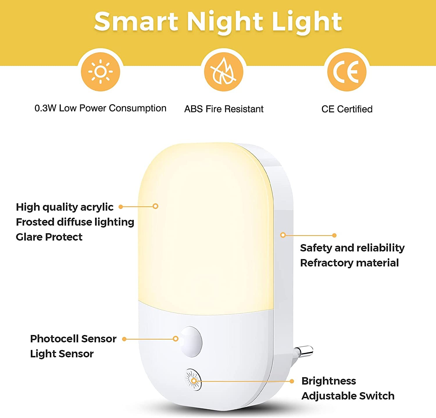 • 💡 【3 modes d'éclairage : AUTO/OFF/ON】 : cette veilleuse LED dispose d'un capteur photocellule du crépuscule à l'aube, elle peut détecter l'obscurité et s'allumer automatiquement. En mode AUTO, la veilleuse s'allumera automatiquement au crépuscule, la nuit ou dans des conditions de faible luminosité, et s'éteindra automatiquement à l'aube, pendant la journée ou dans des conditions de forte luminosité. Vous pouvez également choisir manuellement les modes OFF/ON selon vos besoins.