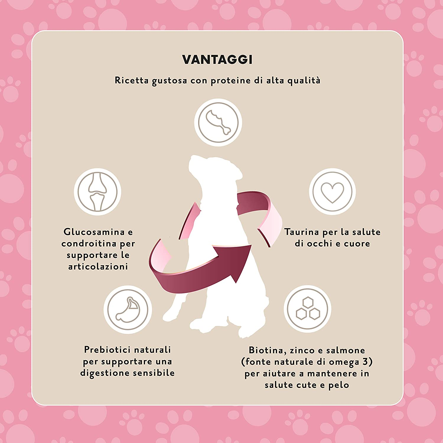 - Biotina, zinco e salmone (una naturale fonte di Omega 3) per favorire la salute di pelle e mantello