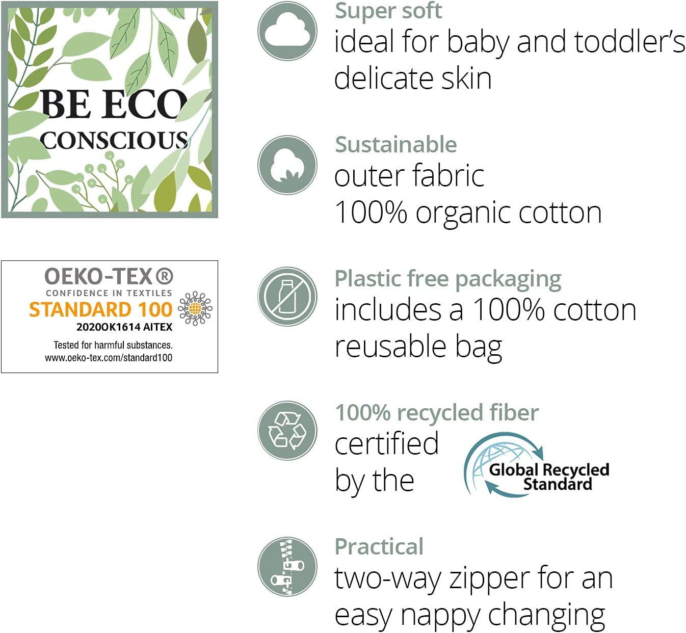 - TISSU ULTRA-DOUX composé de coton biologique (GOTS), procure une SENSATION SOYEUSE AU TOUCHER, idéale pour la peau délicate des nouveau-nés. De plus, le tissu a une EXCELLENTE RESPIRABILITÉ, garantissant un produit d'EXCELLENTE QUALITÉ ET DE LONGUE DURÉE. Le garnissage de nos sacs de couchage est composé à 100% de fibre de polyester recyclé.