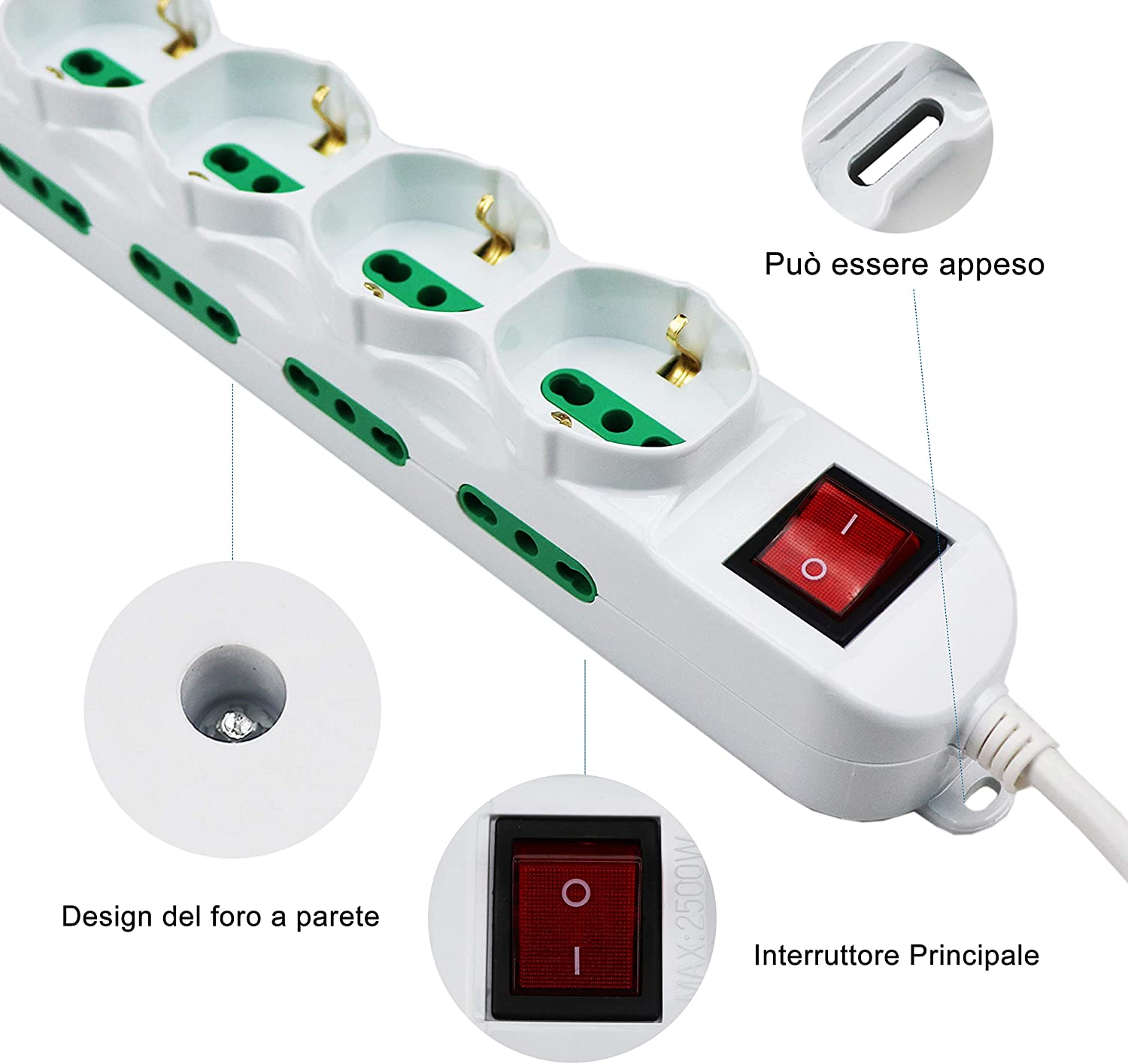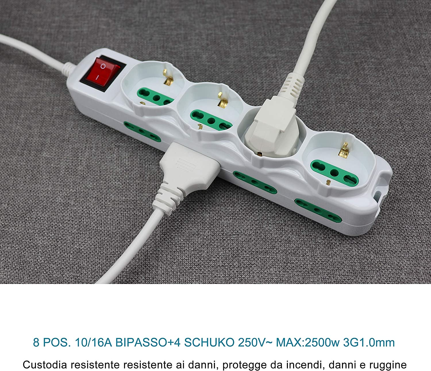 - Ciabatta multipresa con presa di corrente con spine Ita 10A/16A Schuko, ciabatta dotata di fori con protezione per bambini.
