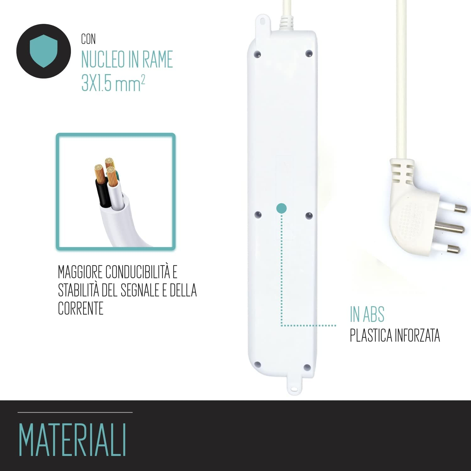 Tipo di SpinaTutte le multiprese Ewent sono dotate di una spina italiana 10A (tipo L). Grazie alla sua forma è perfetta come salva spazio anche negli ambienti più costretti. | InterruttoreLe multiprese Ewent sono dotate di un interruttore per essere accese e spente facilmente. L’interruttore emana una leggera luce in modo tale che permetta di vedere subito se sta passando la corrente. | NucleoTutte le nostre multiprese sono progettate con il nucleo in rame 3x1.5 mm2 che consente una maggiore conducibilità e stabilità del segnale e della corrente elettrica e dunque una maggiore sicurezza. | MaterialeLe multiprese Ewent sono costruite in resistente plastica ABS rinforzata per essere posizionate anche a terra. |