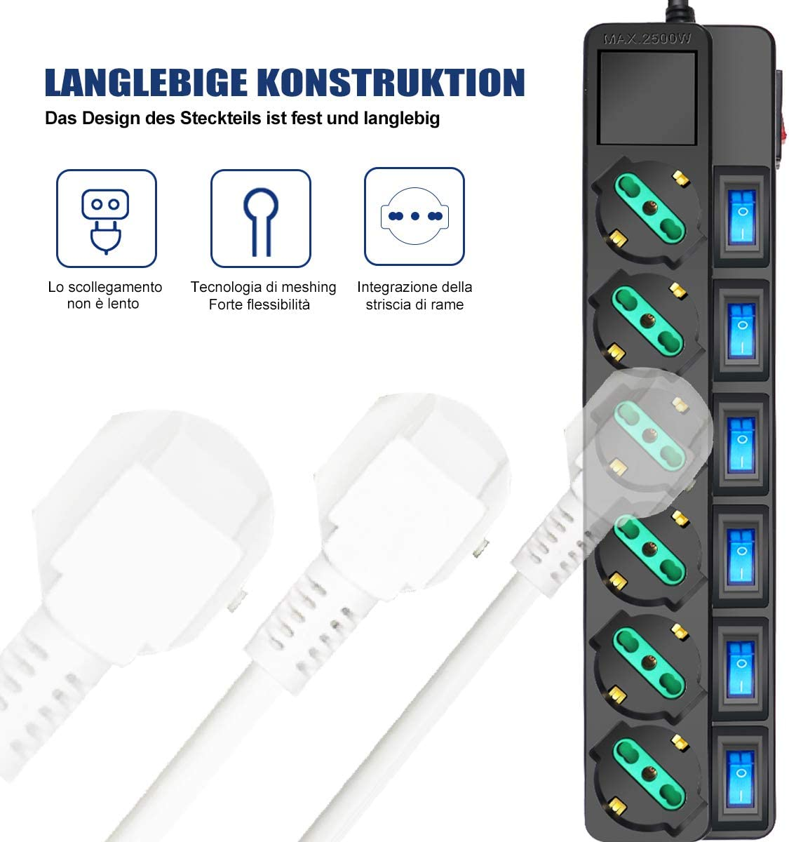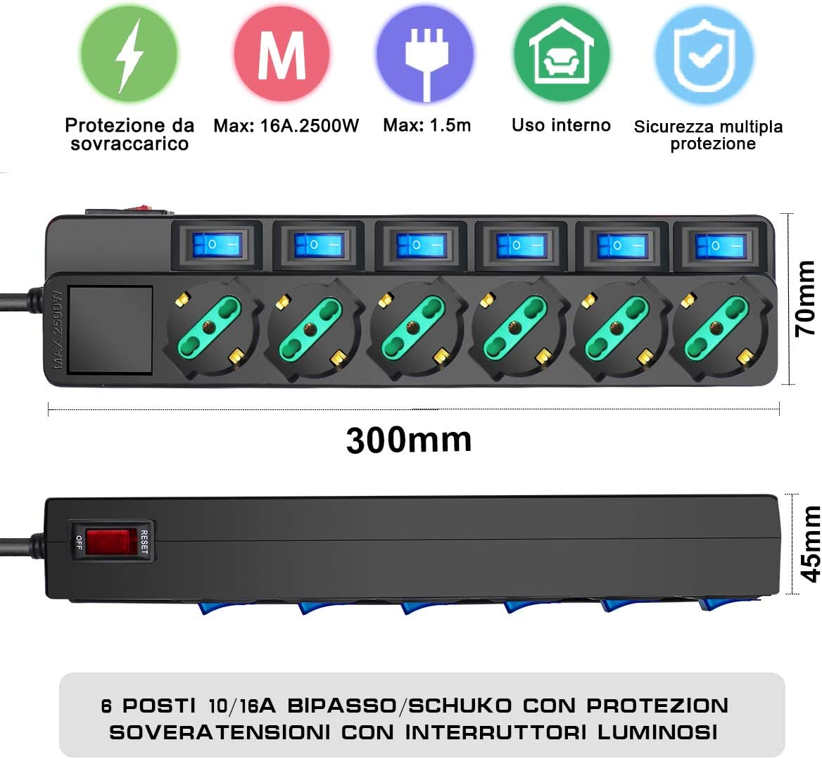 - 6 uscite con presa di corrente con spine Ita 10A/16A Schuko, Bipasso Schuko,con interruttori indipendenti ,ciabatta dotata di fori con protezione per bambini.