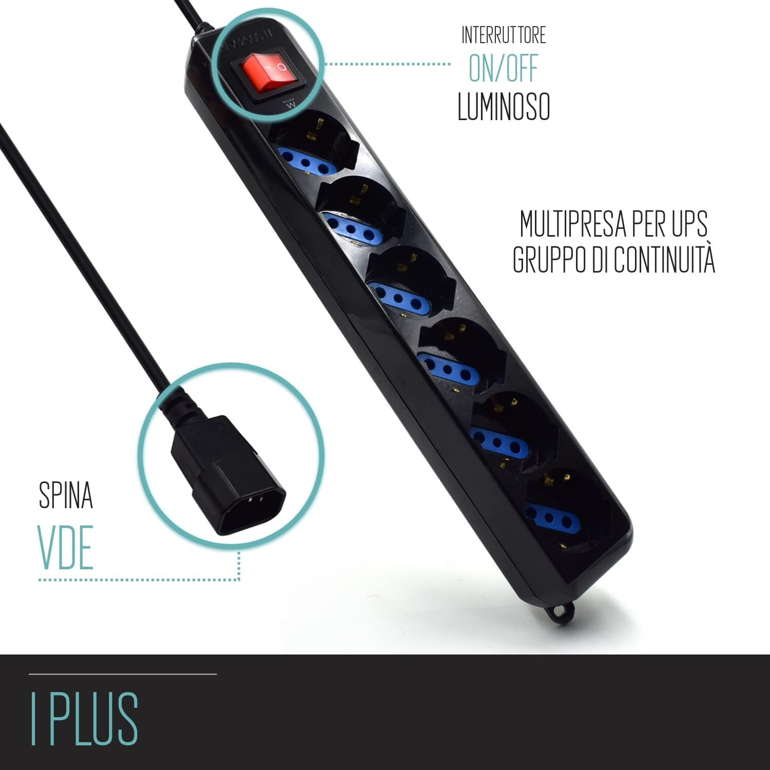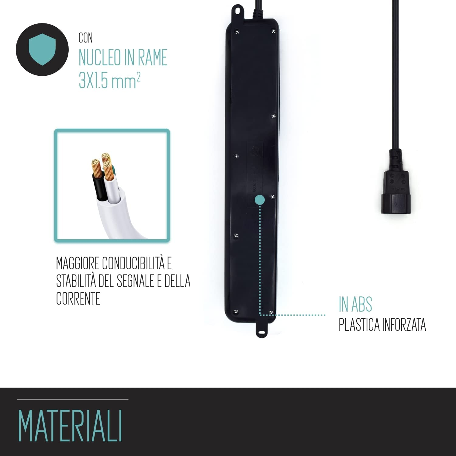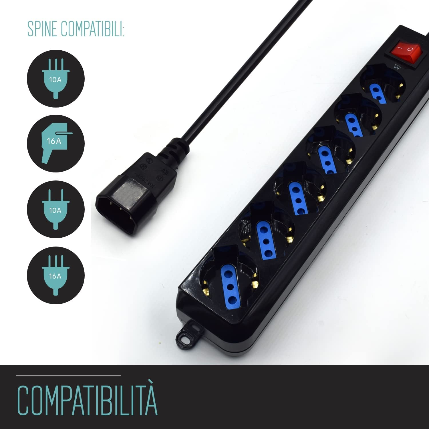 Dotata di 6 uscite con spine Italiane 10/16A e Schuko/Tedesche. Prese angolate a 45° ideali come salva spazio. Cavo di alimentazione lungo 1,5 metri con spina VDE. Specifiche cavo: H05VV-F 3G 1.0 mm2. Completa di interruttore luminoso e dotata di occhielli per il fissaggio a muro/parete.
