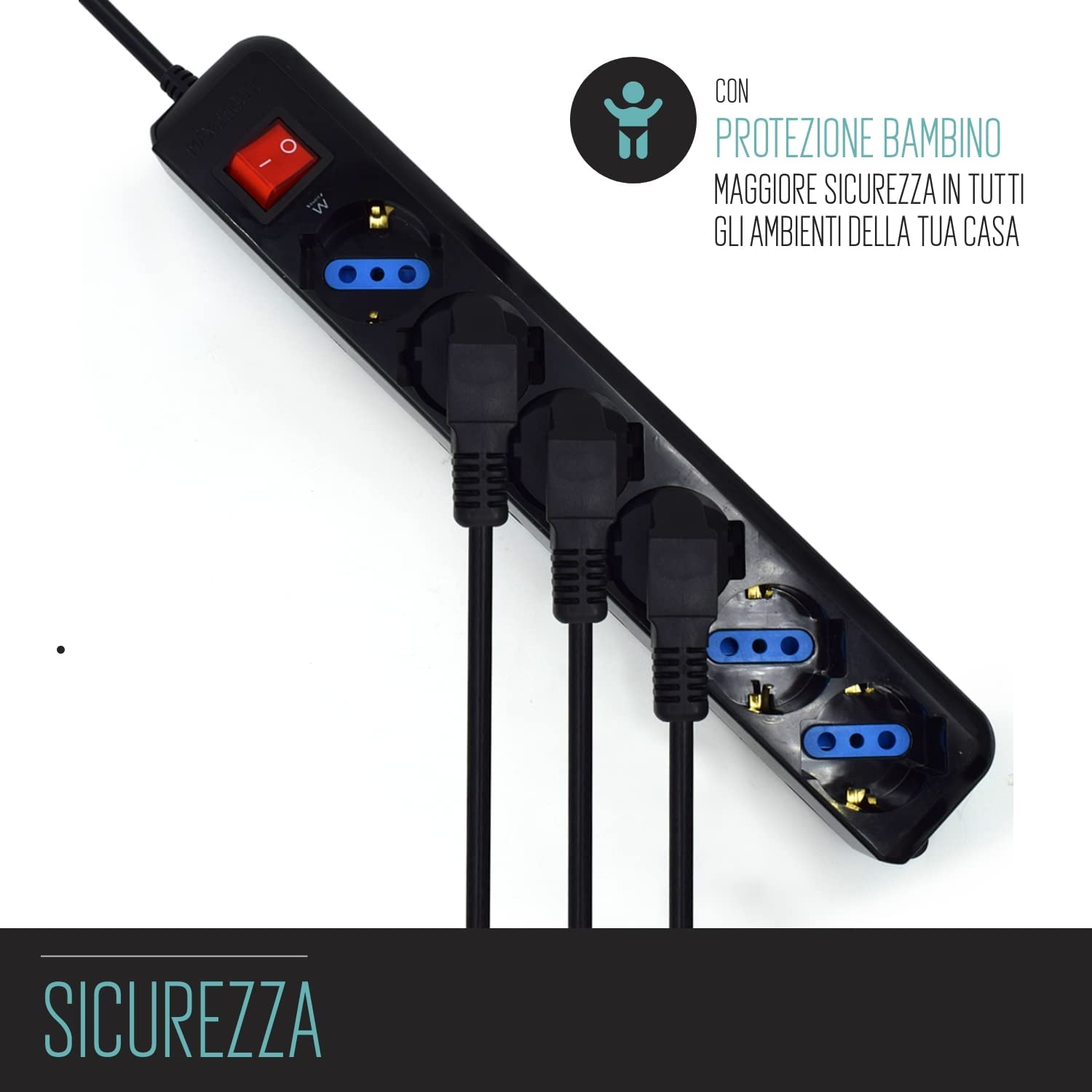 - La multipresa è dotata di protezione sovraccarichi e sovratensione Oxide Varistor. Ciabatta dotata di fori con protezione per bambini