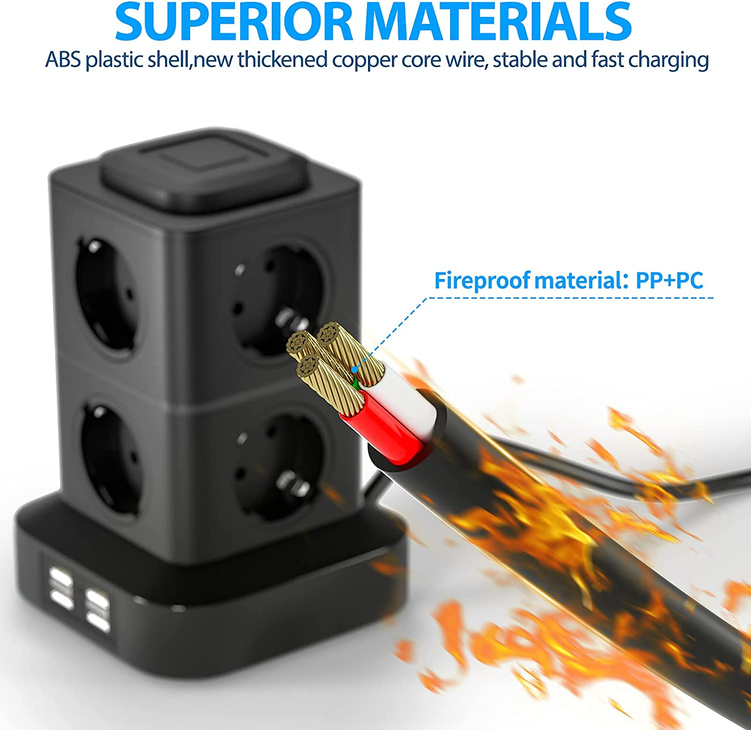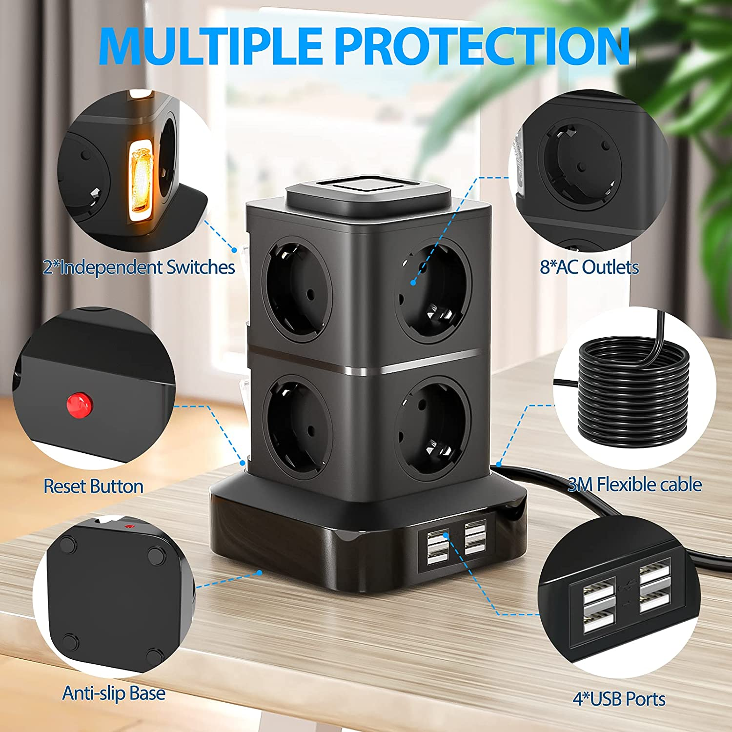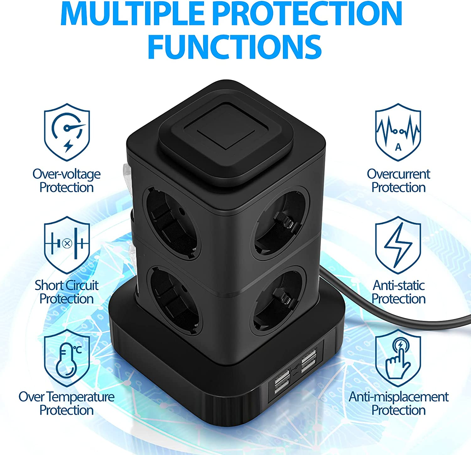 Protezione da SovraccaricoLe prese multiple verticali sono completamente configurabili per una varietà di condizioni di sovraccarico, come protezione da sovratensione,protezione da cortocircuito,protezione da sovratemperatura,protezione da sovracorrente,protezione antistatica,protezione contro lo smarrimento,proteggi la tua famiglia | Porta di Sicurezza di Design a Prova di bambinoLa presa multipla è dotata di uno sportello di sicurezza appositamente progettato per fermare gli incidenti causati dal tocco dei bambini, che fondamentalmente impedisce ai bambini di toccare accidentalmente l'alimentazione e provoca incidenti e garantisce la sicurezza dei bambini | Interruttore IndividualePrese Ogni strato di prese è dotato di un interruttore indipendente. Accendere l'interruttore, se l'interruttore mostra una luce, significa che è pronto per l'uso. Quando si utilizza una presa, è possibile disattivare l'interruttore sull'altro livello, in modo da poter risparmiare energia mentre lo si utilizza. | Porta di ricarica rapida usbLa presa USB multifunzione con presa dispone di 4 spine di ricarica rapida da 5V, 3,1A. Quando hai una riunione di famiglia, o quando gli amici fanno visita, quando è necessario caricare telefoni cellulari, laptop, iPad e altri dispositivi elettronici, non ti preoccuperai del numero troppo basso di porte. |