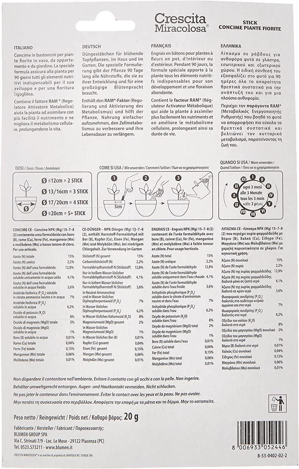Bâtonnets d'engrais pour plantes à fleurs en pots, appartements et jardins. La formule spéciale garantit à la plante tous les éléments nutritionnels essentiels à son développement et à une floraison luxuriante pendant 90 jours. Un blister contient 20 pièces, 1 stick tous les 90 jours.