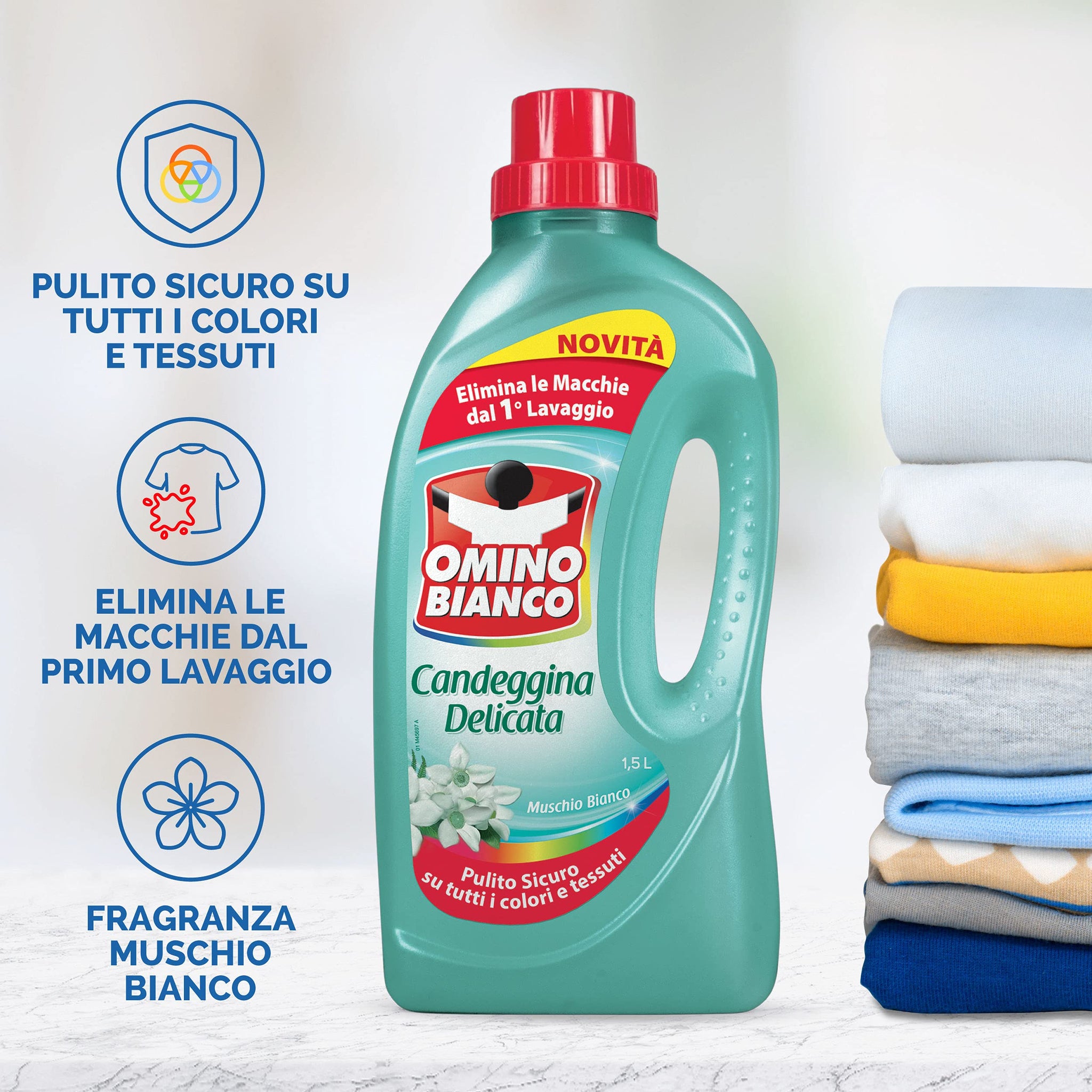 Omino Bianco - Candeggina Delicata, Tecnologia Anti Odor, Azione Igienizzante e Smacchiante, Essenza Muschio Bianco, 1500 ml