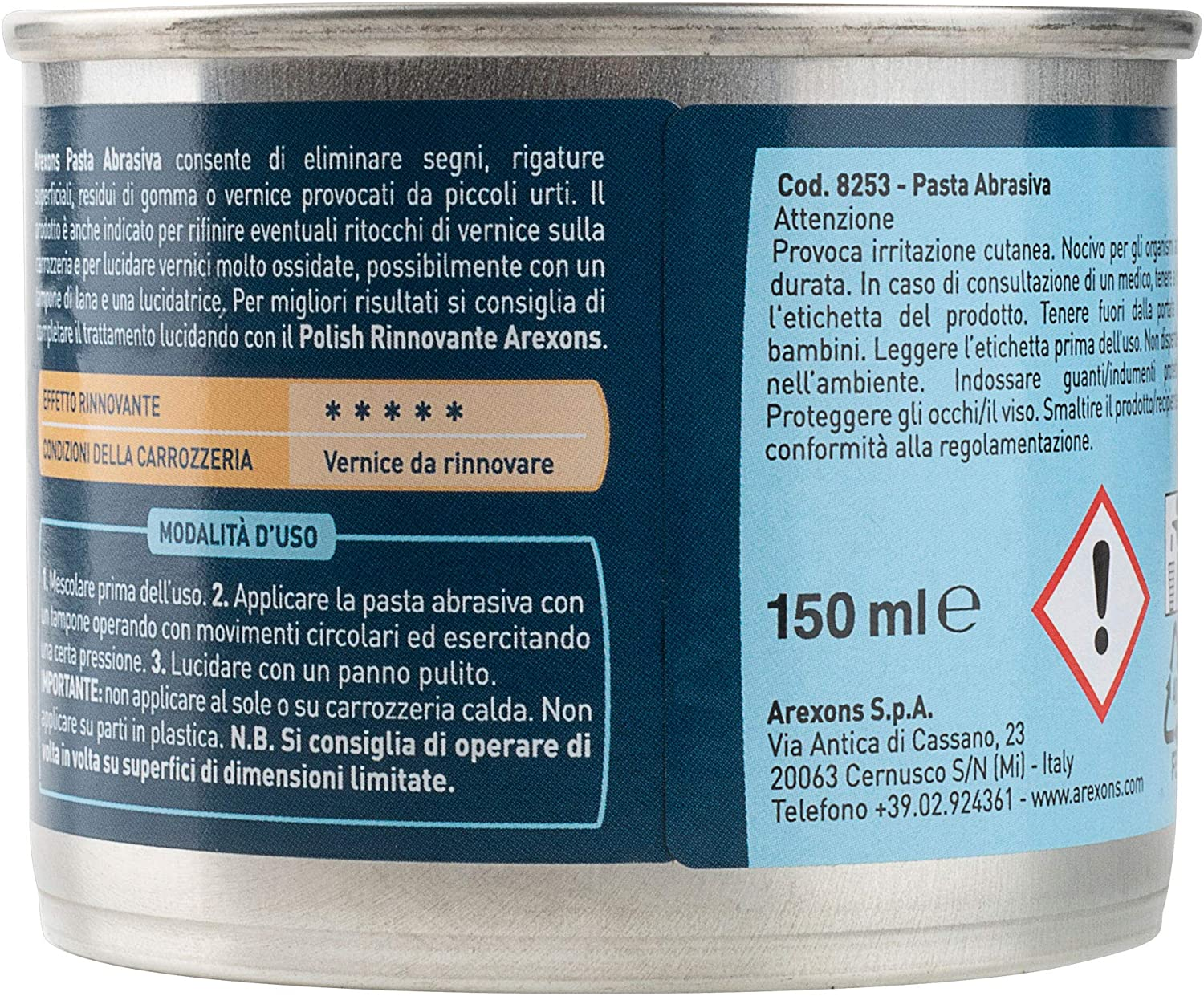 - RIPRISTINA LA LUCENTEZZA DELLA VERNICE - Con la pasta abrasiva Arexons puoi eliminare il fumo di verniciatura, le puntinature, i piccoli graffi alla carrozzeria, ma anche ripristinare la lucentezza della vernice ormai vecchia e opacizzata.