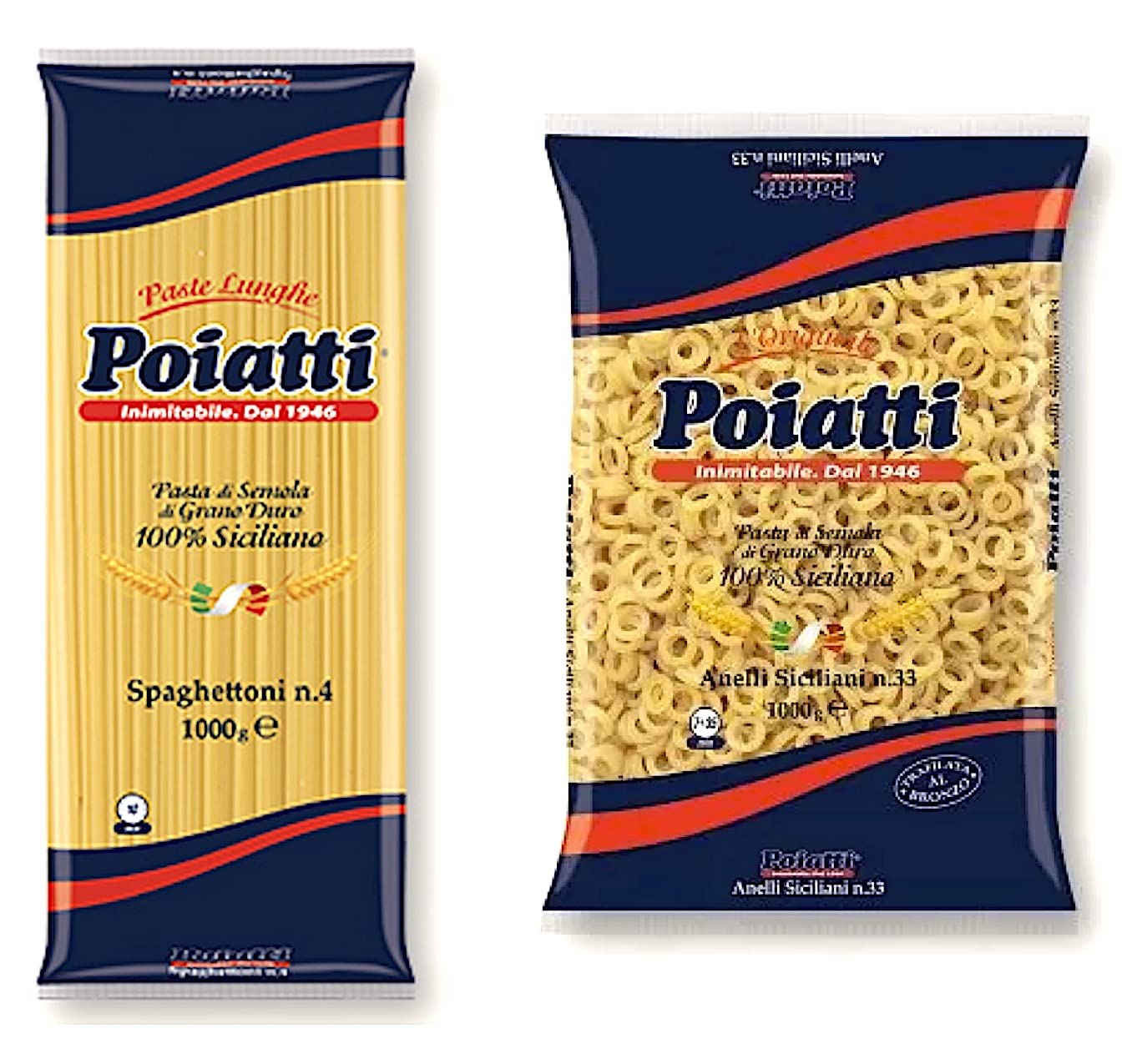 Spaghettoni e anelletti siciliani Poiatti, offerta "multipack famiglia" da 10 Kg. complessivi, formati da 5 pacchi da 1 Kg. di spaghettoni nr.4, un formato più grosso dei normali spaghetti, posto tra lo spaghetto e il bucatino, e 5 pacchi da 1 Kg. di anellini nr.33 ottimi per tutte le ricette da forno, come timballi di pasta, anelletti alla norma, anellini al forno. La pasta Poiatti (BLU) del pastificio di Mazara del Vallo (TP) utilizza esclusivamente farina di grano duro siciliana al 100%, non mischiata o miscelata con grani europei o di importazione, garantendo una sicurezza estrema anche per il consuno dei più piccoli, e una qualità TOP eccellente.