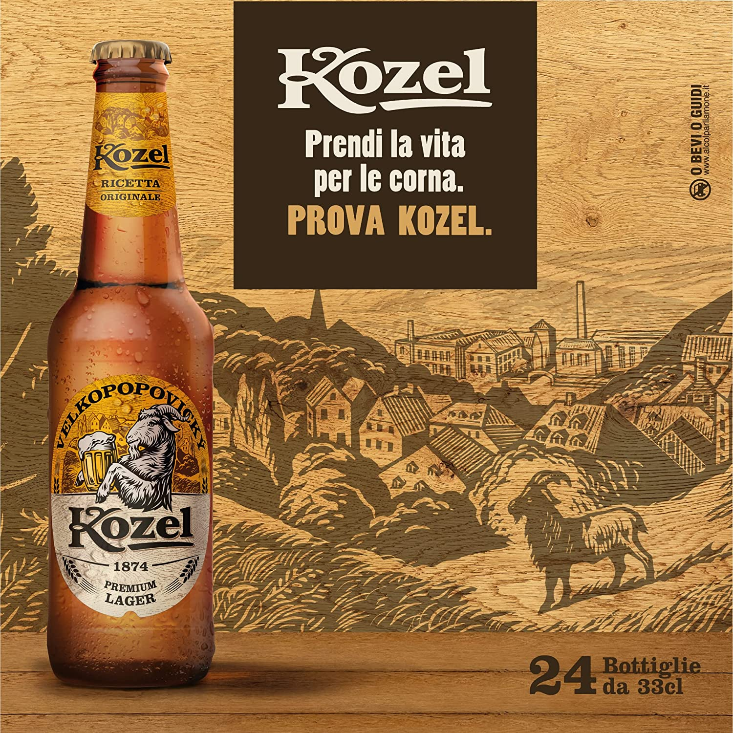 Bière Kozel Premium Lager, caisse de 24 bières en bouteilles de 33 cl. Kozel Lager est une Premium de la tradition tchèque avec un goût riche et doux et un arôme délicat de malt et de houblon. Produit selon la recette originale et en double décoction, selon la méthode traditionnelle des brasseurs tchèques, ce pur malt naît du savant mélange de 3 malts sélectionnés et de houblons nobles tchèques fins, qui lui confèrent un goût équilibré et un arôme agréable.