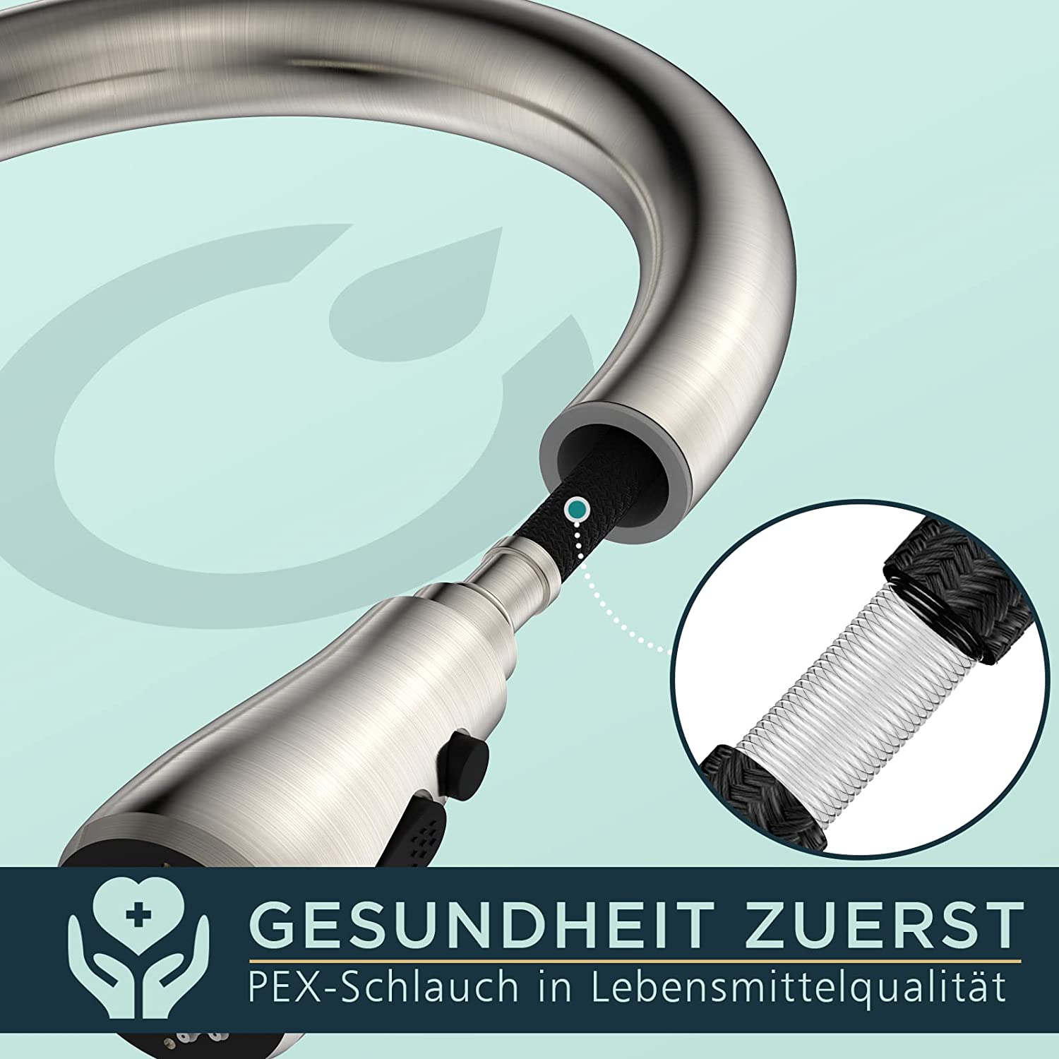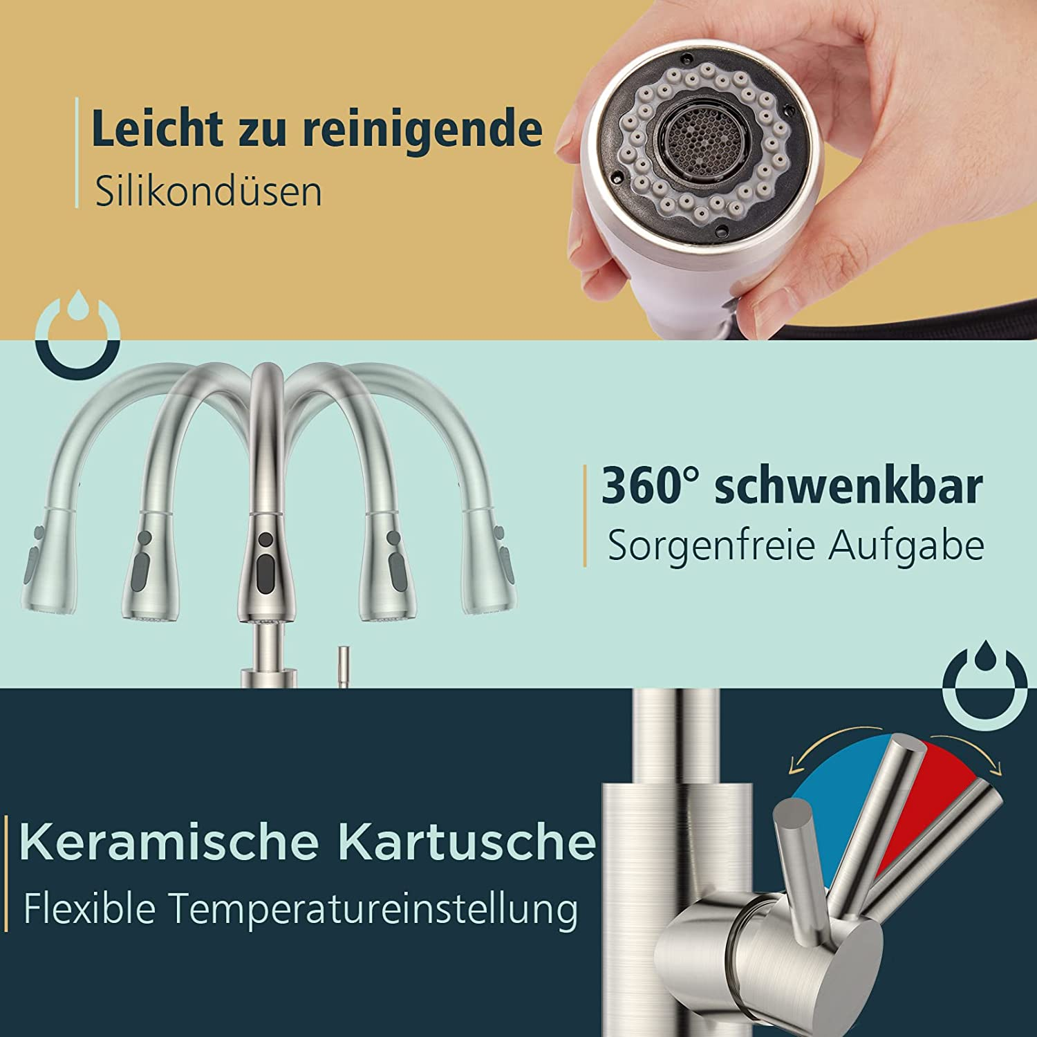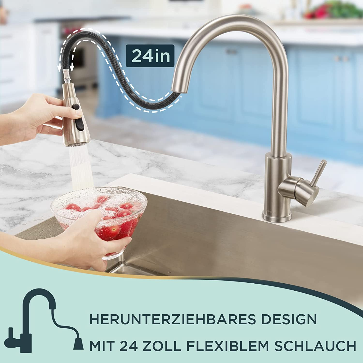 - [Prenditi cura di te e della tua famiglia] Realizzato in acciaio inossidabile di alta qualità, il rubinetto da cucina estraibile senza piombo e nichel è molto più sicuro dei normali rubinetti, in modo da poter utilizzare liberamente il miscelatore da cucina. Il materiale in acciaio inox di alta qualità può prevenire la ruggine o la corrosione del rubinetto della cucina estraibile, per offrire una maggiore durata per il rubinetto del lavello.