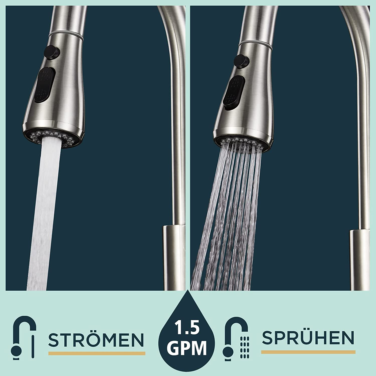 - [2 tipi di getto d'acqua] questo rubinetto da cucina è dotato di 2 getti d'acqua, tra cui stream, spray. Il getto d'acqua ha un design ad alta pressione e offre un potente getto per i lavori di lavaggio pesanti e per la facilità di pulizia. Il pulsante di pausa ti permette di usare l'acqua meglio e di risparmiare acqua.