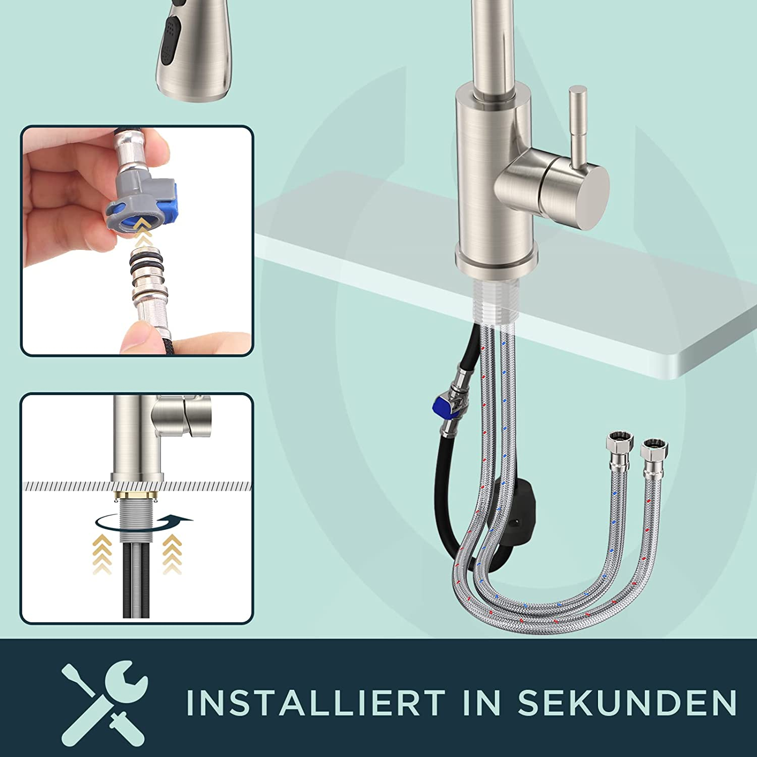 - [Facile installazione] questo rubinetto da cucina estensibile è adatto per quasi tutti i lavelli da cucina. Si prega di seguire le fasi di installazione nelle istruzioni (lingua italiana non garantita) e di installare questo pratico rubinetto da cucina in pochi minuti e poi utilizzarlo.