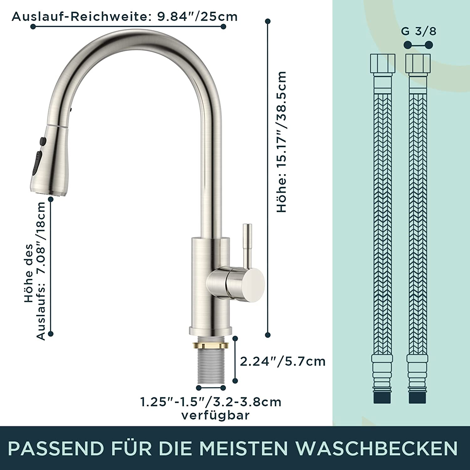 - [Super scelta] Questo rubinetto è alto 38.5 cm, l'altezza del beccuccio è di 18 cm, la lunghezza della doccetta è di 60 cm e la portata è di 1,5 gpm. Si prega di verificare prima dell'acquisto se il rubinetto della cucina è adatto alla vostra cucina. Ci impegniamo a fornire a ogni cliente un arredamento di alta qualità. Se avete domande sull'installazione o sull'utilizzo di questo rubinetto, vi preghiamo di contattarci, saremo lieti di rispondervi.