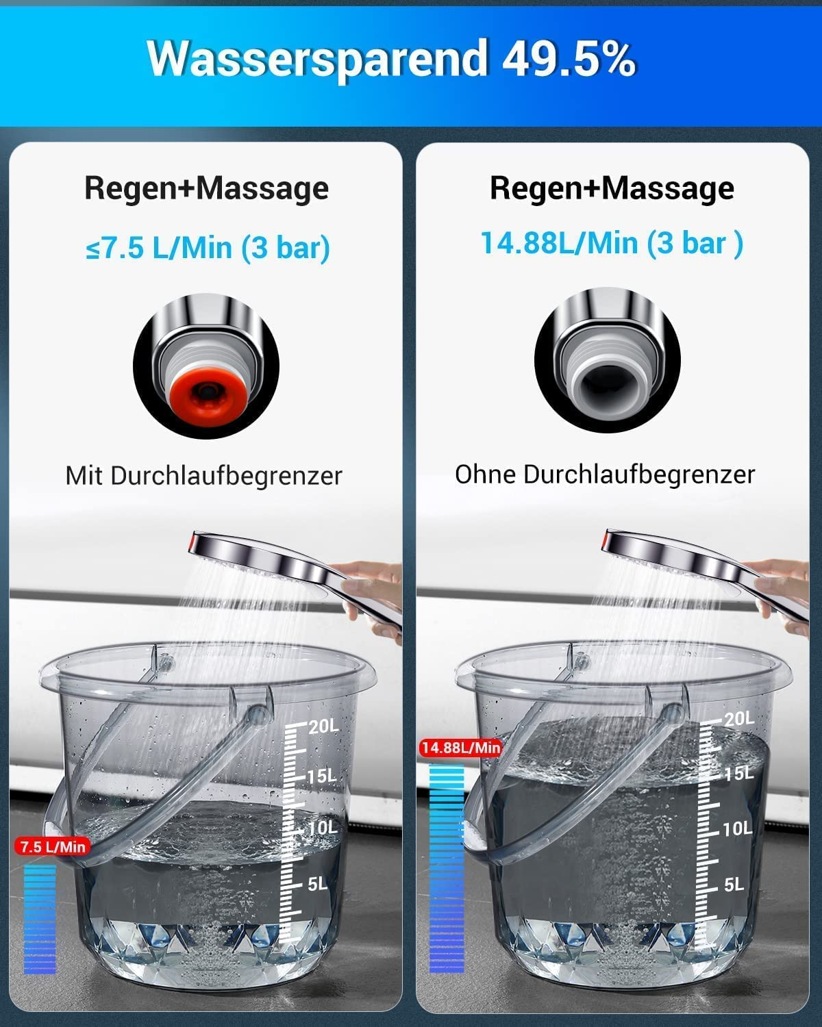 • [Soffione doccia a risparmio d'acqua realizzato in materiale premium]: questo potente soffione doccia a risparmio idrico realizzato in materiale ABS di alta qualità. La delicata superficie cromata lo rende leggero, durevole, antiruggine e non sbiadisce e offre una doccia sicura e confortevole. Con limitatore di flusso, in modalità doccia a pioggia, risparmio d'acqua del 48,3%, con una pressione dell'acqua di 3 bar, il flusso dell'acqua nella doccia è di 6,23 l/min. - 7,69 l/min