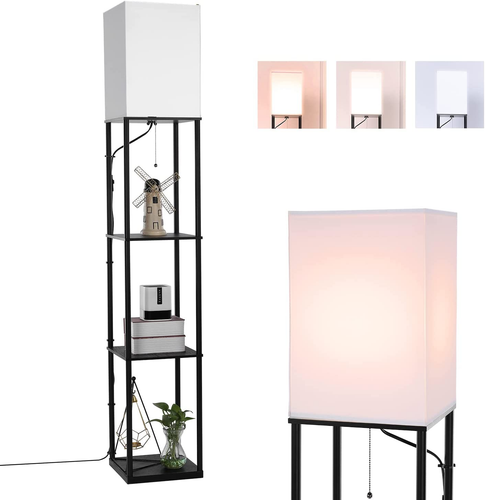 Modern Floor Lamp with Wooden Shelf, 3 Color Temperature Dimmable
